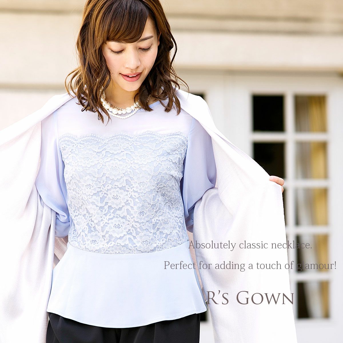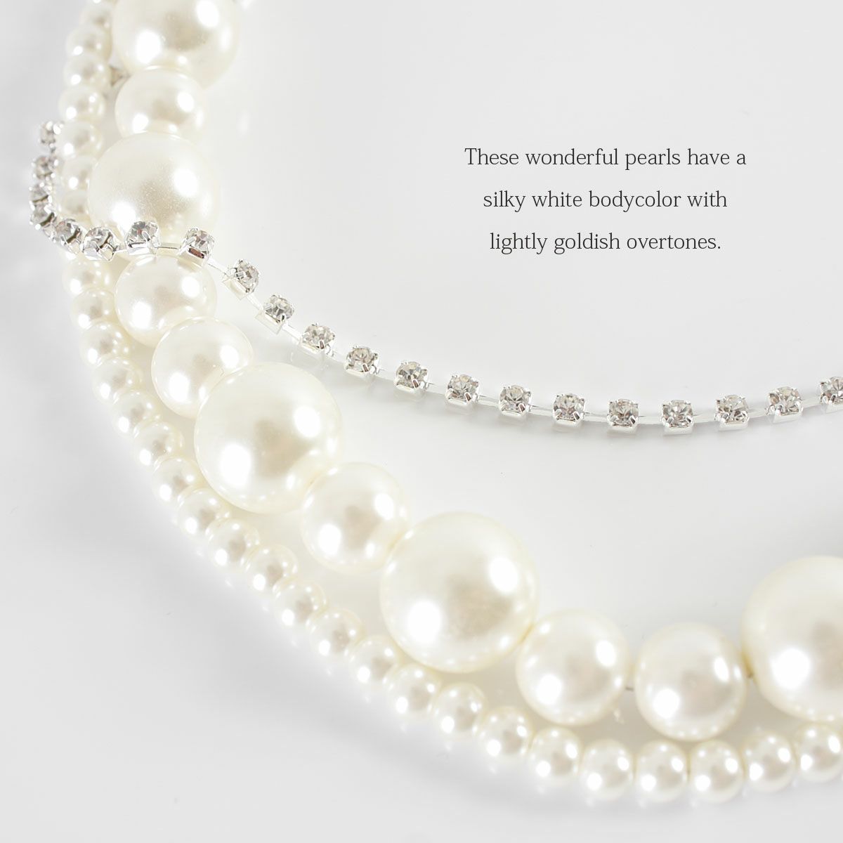 大小のパールを贅沢に使用し、ラインストーンを絡めたゴージャスなネックレスはボリューム満点の存在感です。パール&ラインストーンの煌きが、デコルテを華やかに彩ってくれますよ。ドレスと合わせれば上品でエレガントなコーディネイトに♪オススメのアクセサリーです。