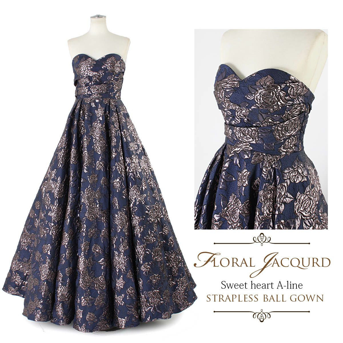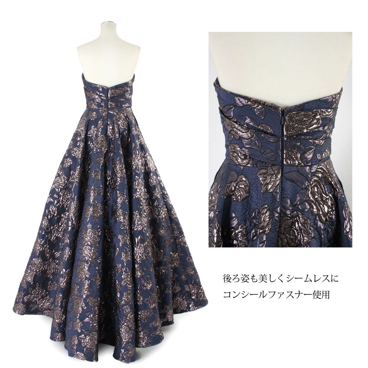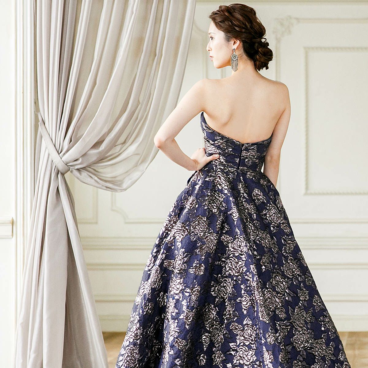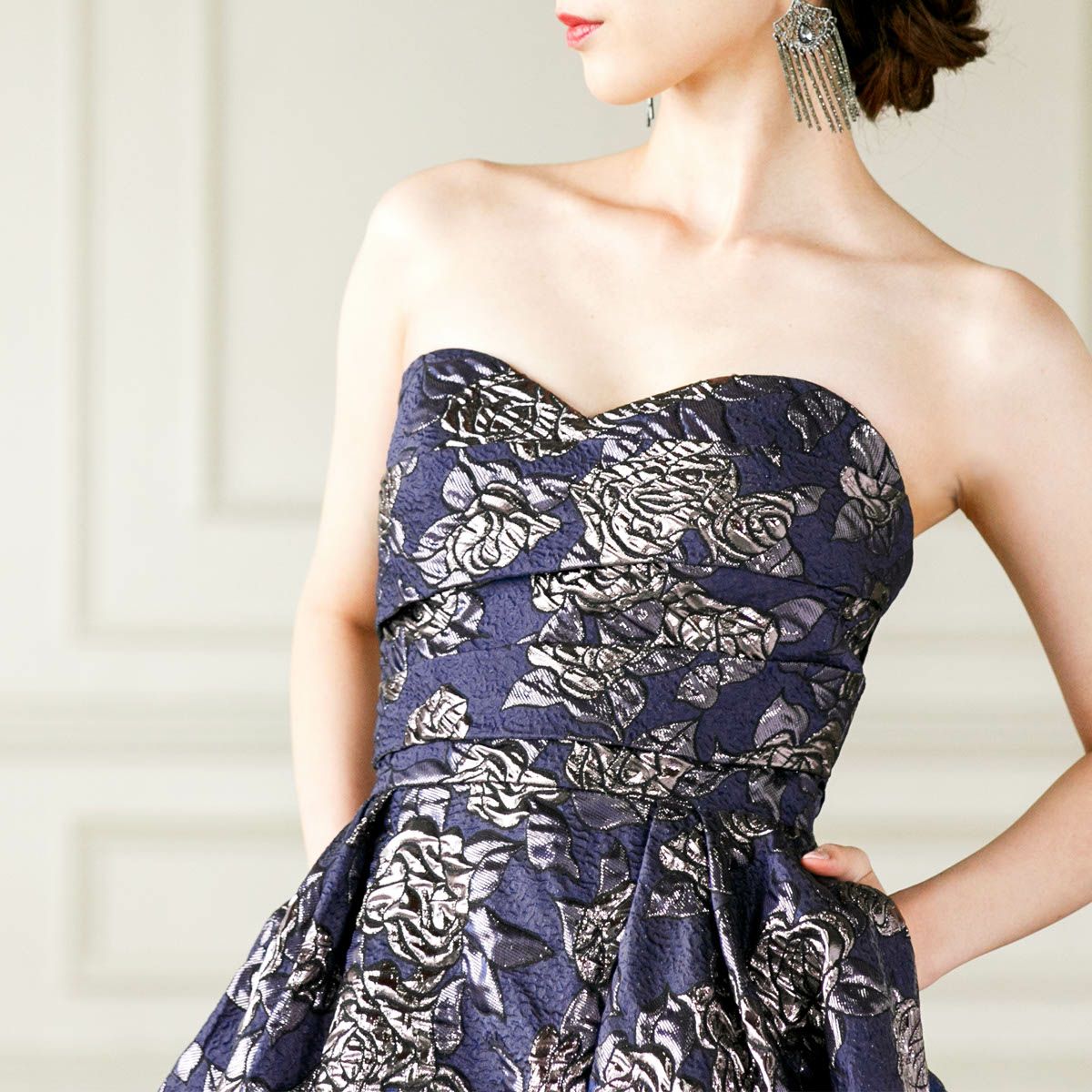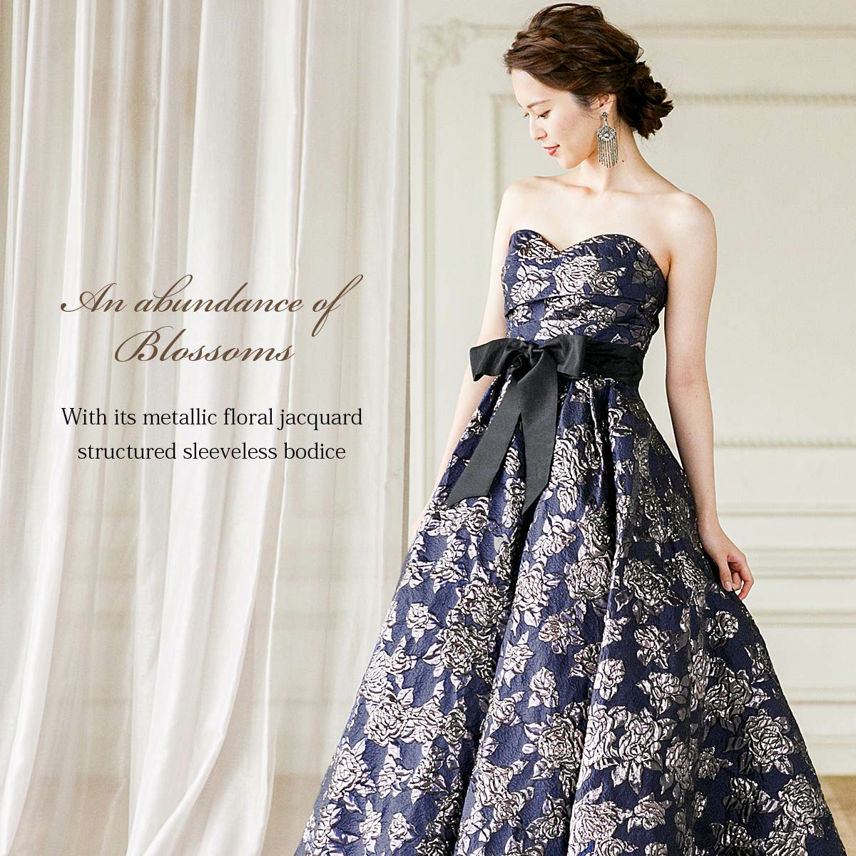 鮮やかに深い藍のようなネイビーに重なるブロンズ色のローズモチーフが特徴のロングドレス。立体的に数種の糸で織られたジャガード素材、優美な印象は観るものを魅了します。胸元で重なる深いプリーツは表情豊かな美しいデコルテラインを作り出し、柔らかな弧を描いたハートカットは女性のしなやかさを表現。
