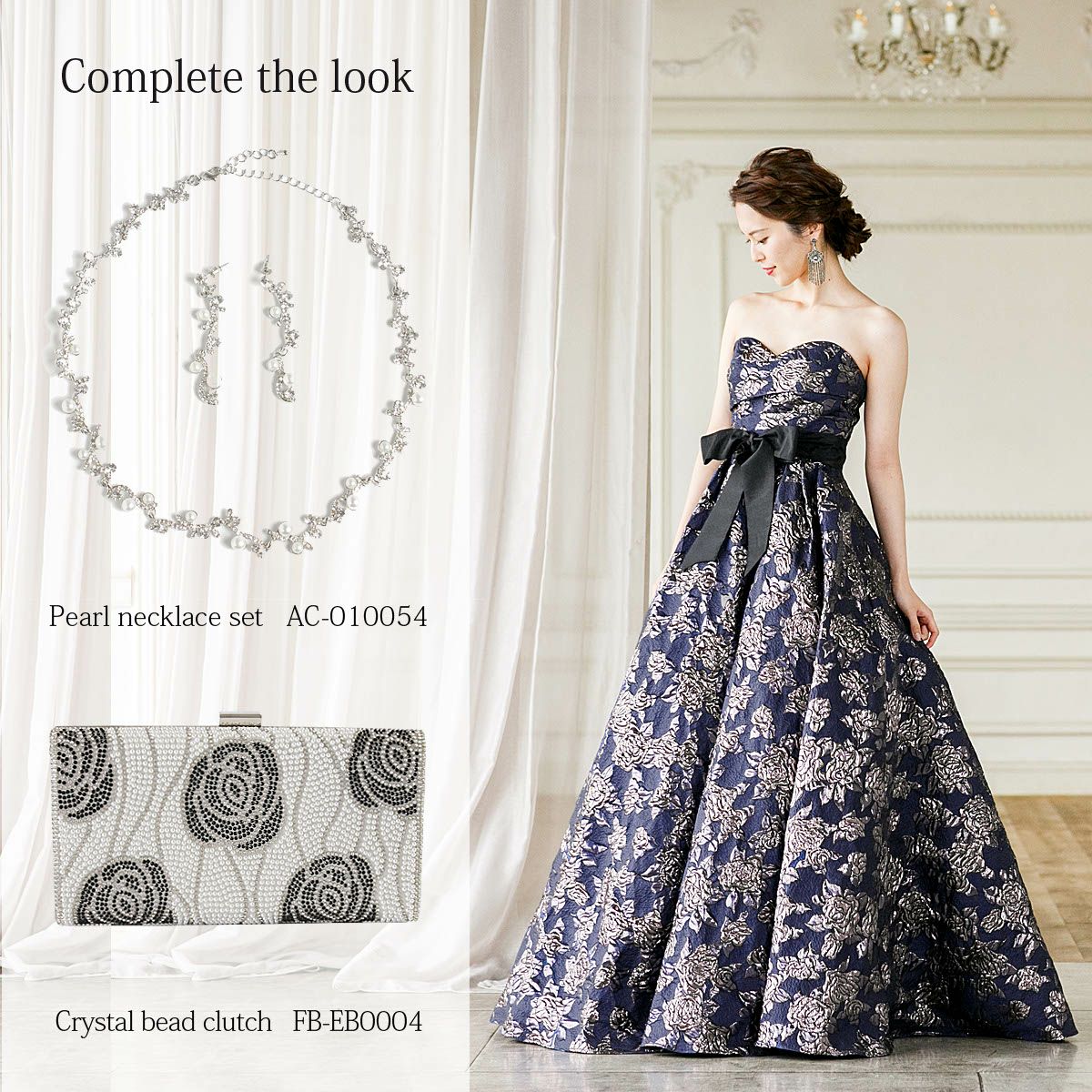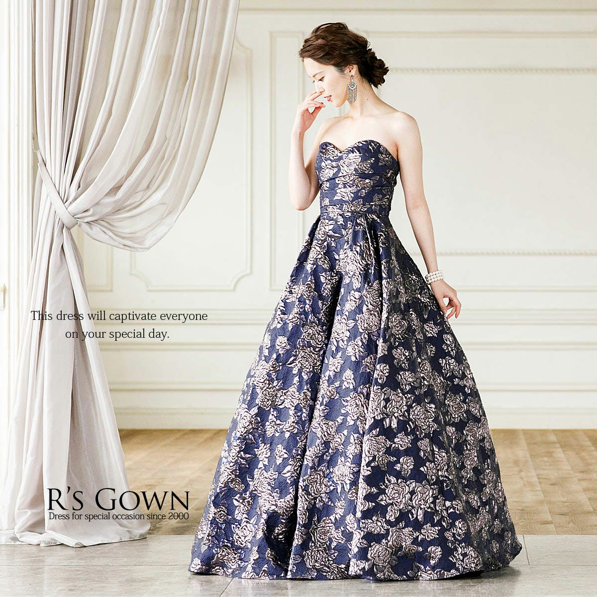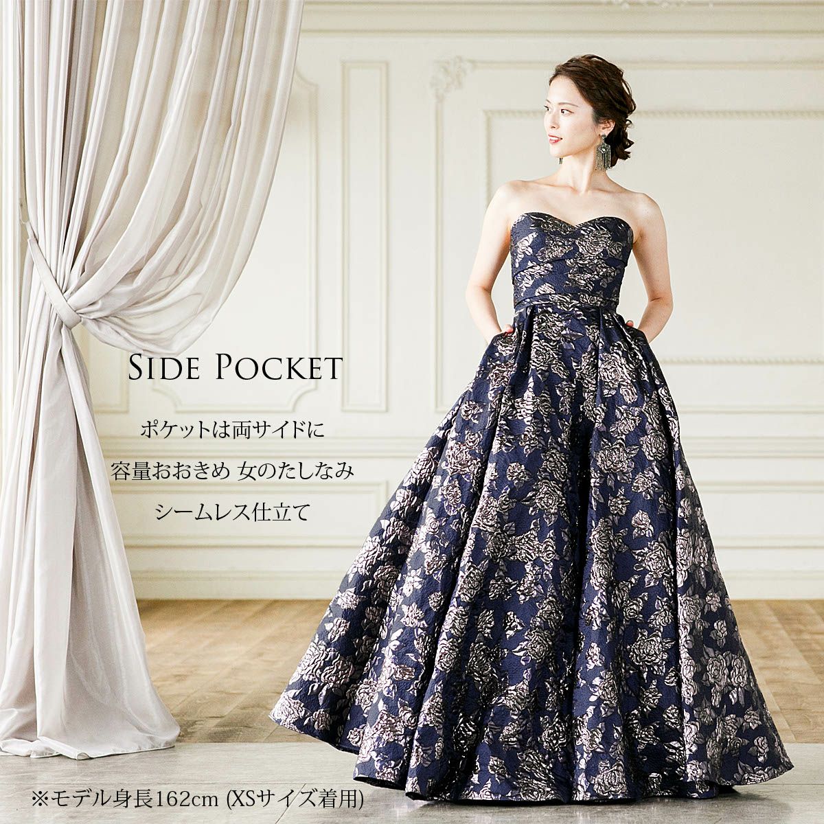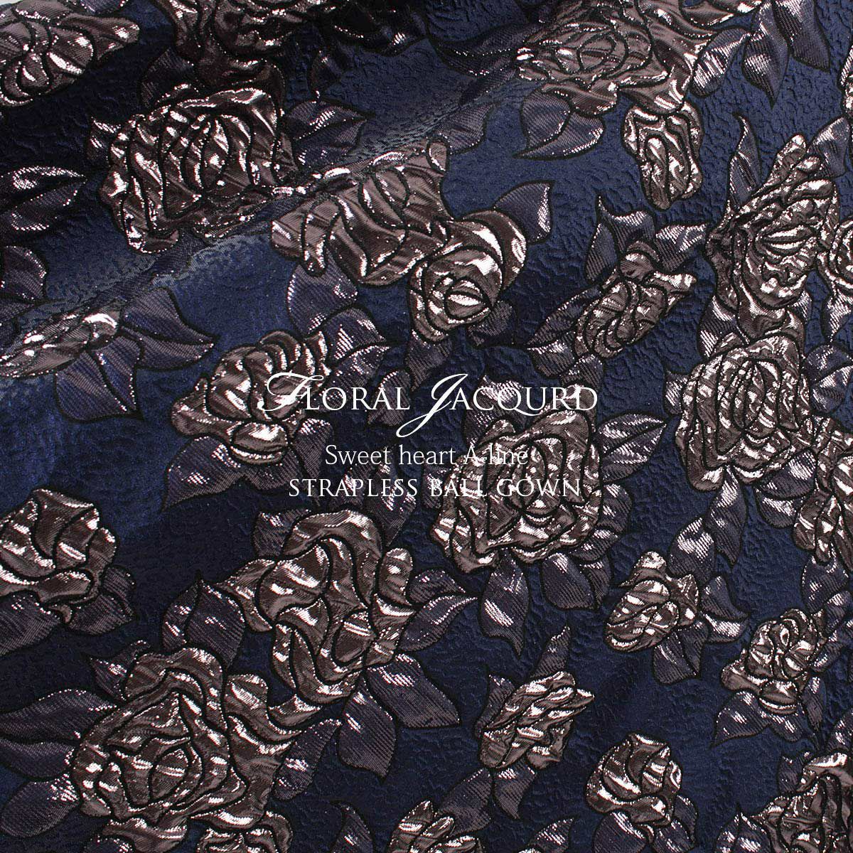 鮮やかに深い藍のようなネイビーに重なるブロンズ色のローズモチーフが特徴のロングドレス。立体的に数種の糸で織られたジャガード素材、優美な印象は観るものを魅了します。胸元で重なる深いプリーツは表情豊かな美しいデコルテラインを作り出し、柔らかな弧を描いたハートカットは女性のしなやかさを表現。