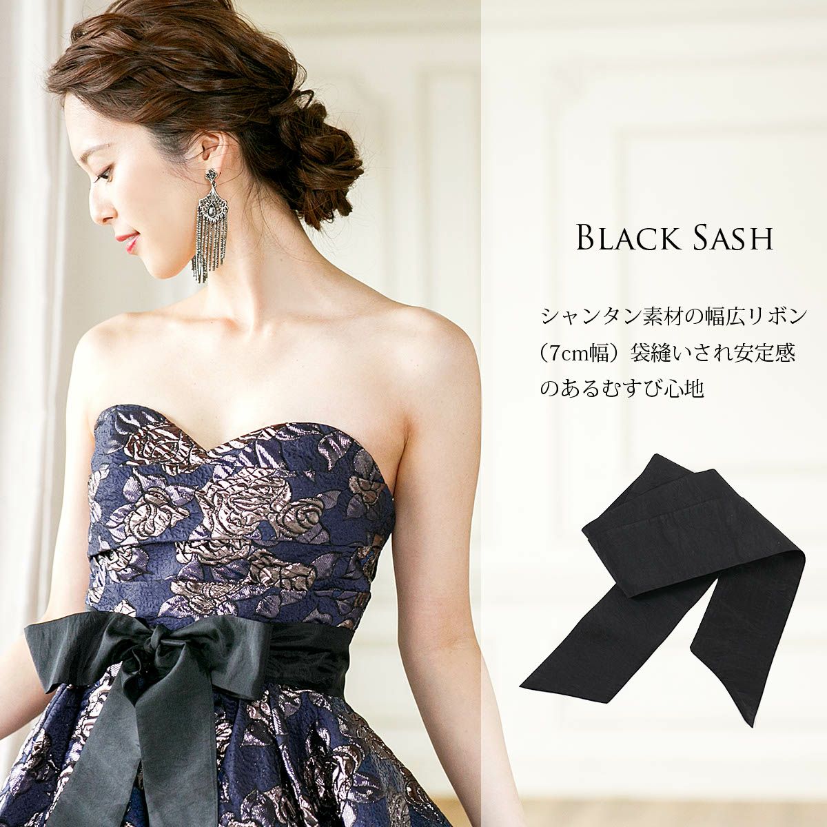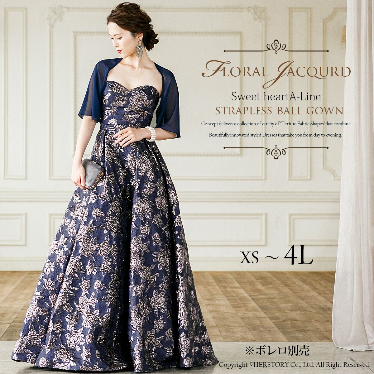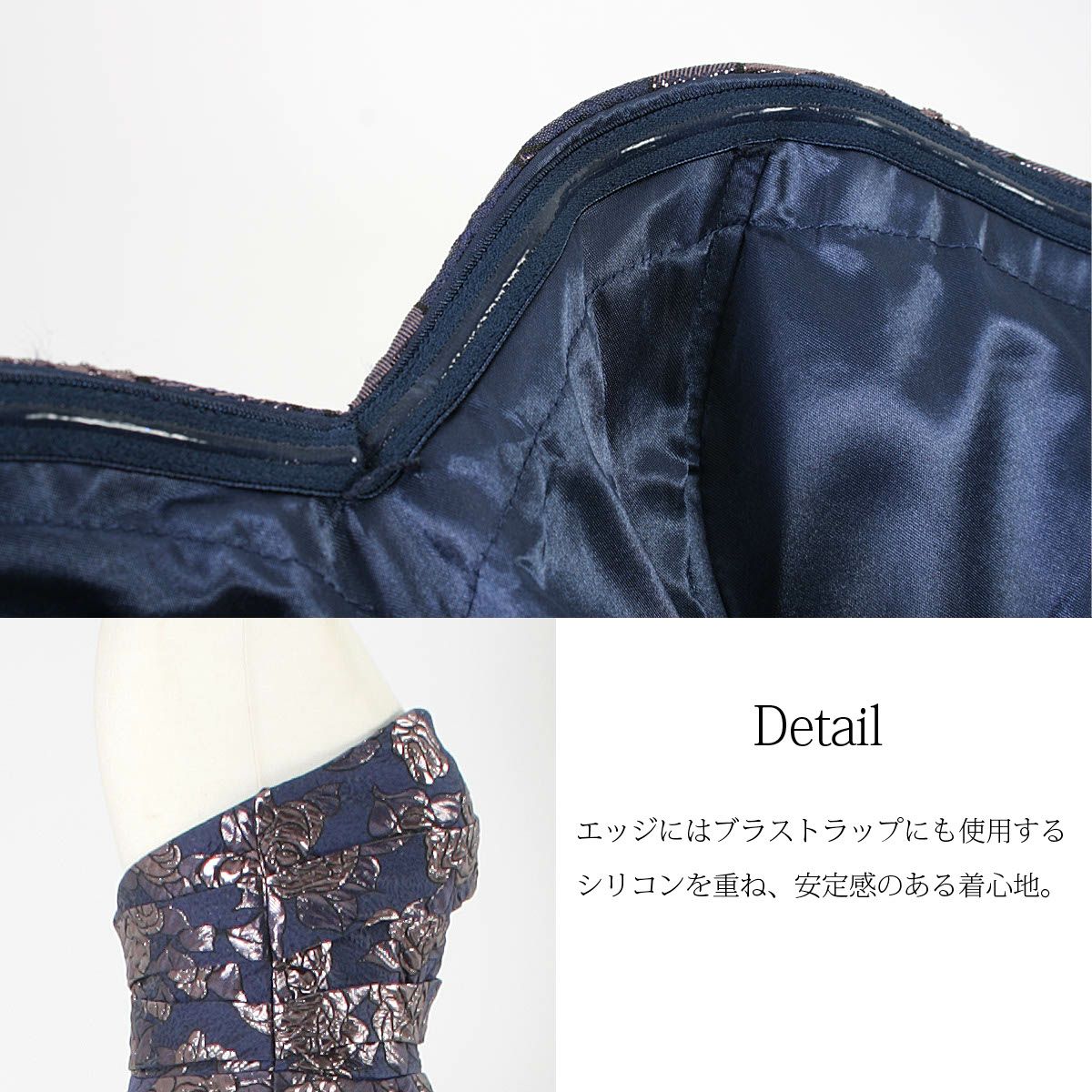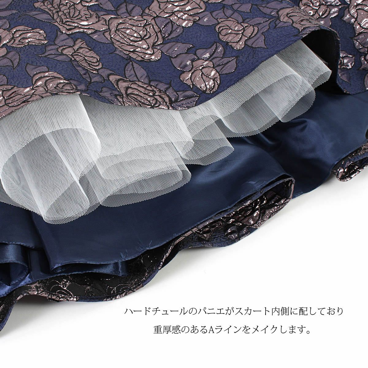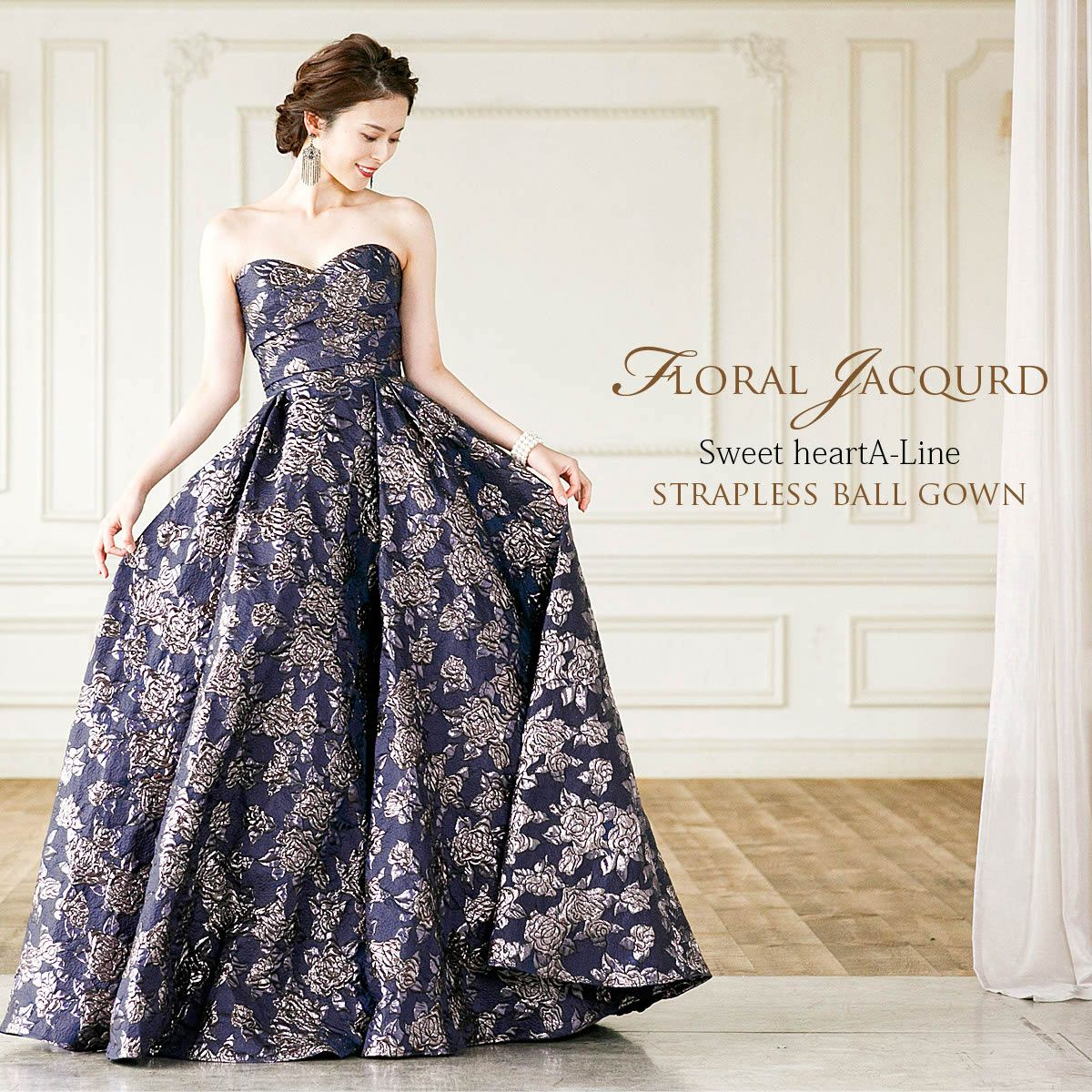 鮮やかに深い藍のようなネイビーに重なるブロンズ色のローズモチーフが特徴のロングドレス。立体的に数種の糸で織られたジャガード素材、優美な印象は観るものを魅了します。胸元で重なる深いプリーツは表情豊かな美しいデコルテラインを作り出し、柔らかな弧を描いたハートカットは女性のしなやかさを表現。