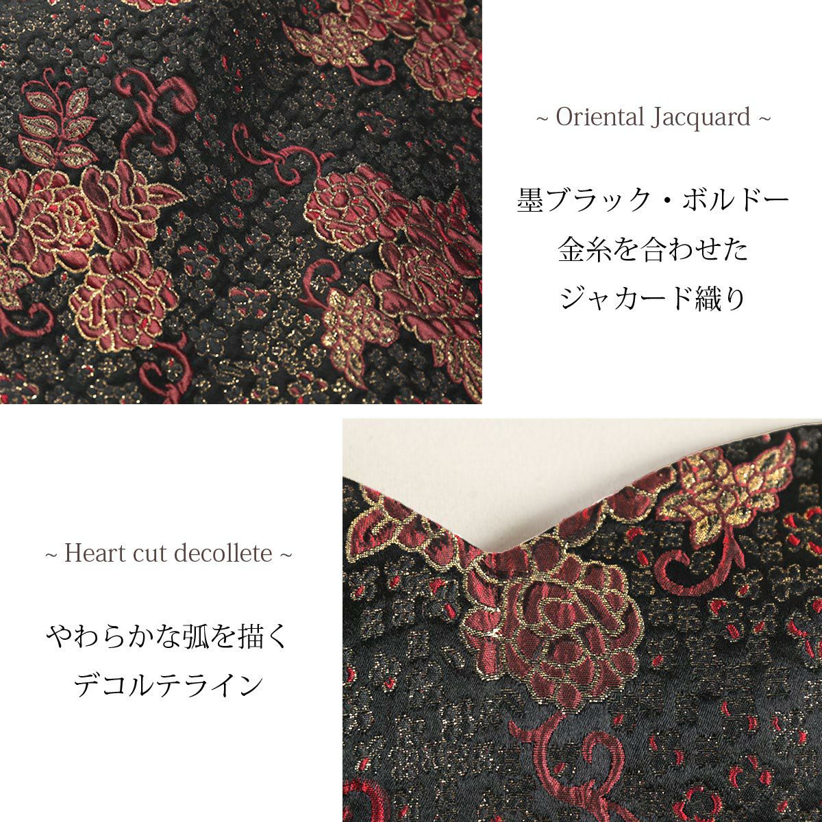 墨クロ・ボルドー(バーガンディー)をベースに金糸を使った縁どりのジャガード織り。深みのあるシックな色味、金糸ならではの繊細な輝きは、クラシックに上品な印象へと。見た目の重厚感はそのままに、軽量の織り素材を使用しています。シワにになり難く目立ちにくい、持ち運びにも最適。