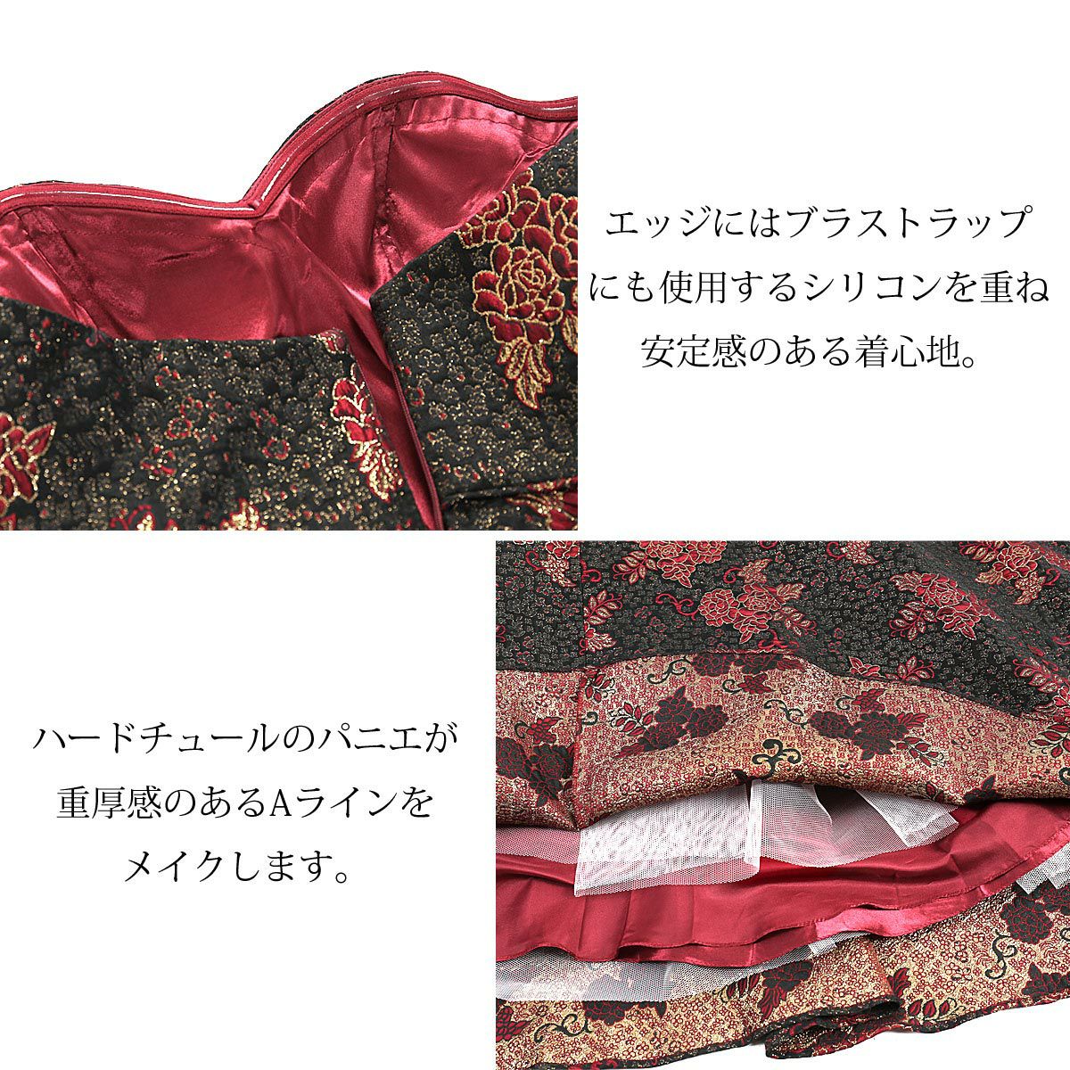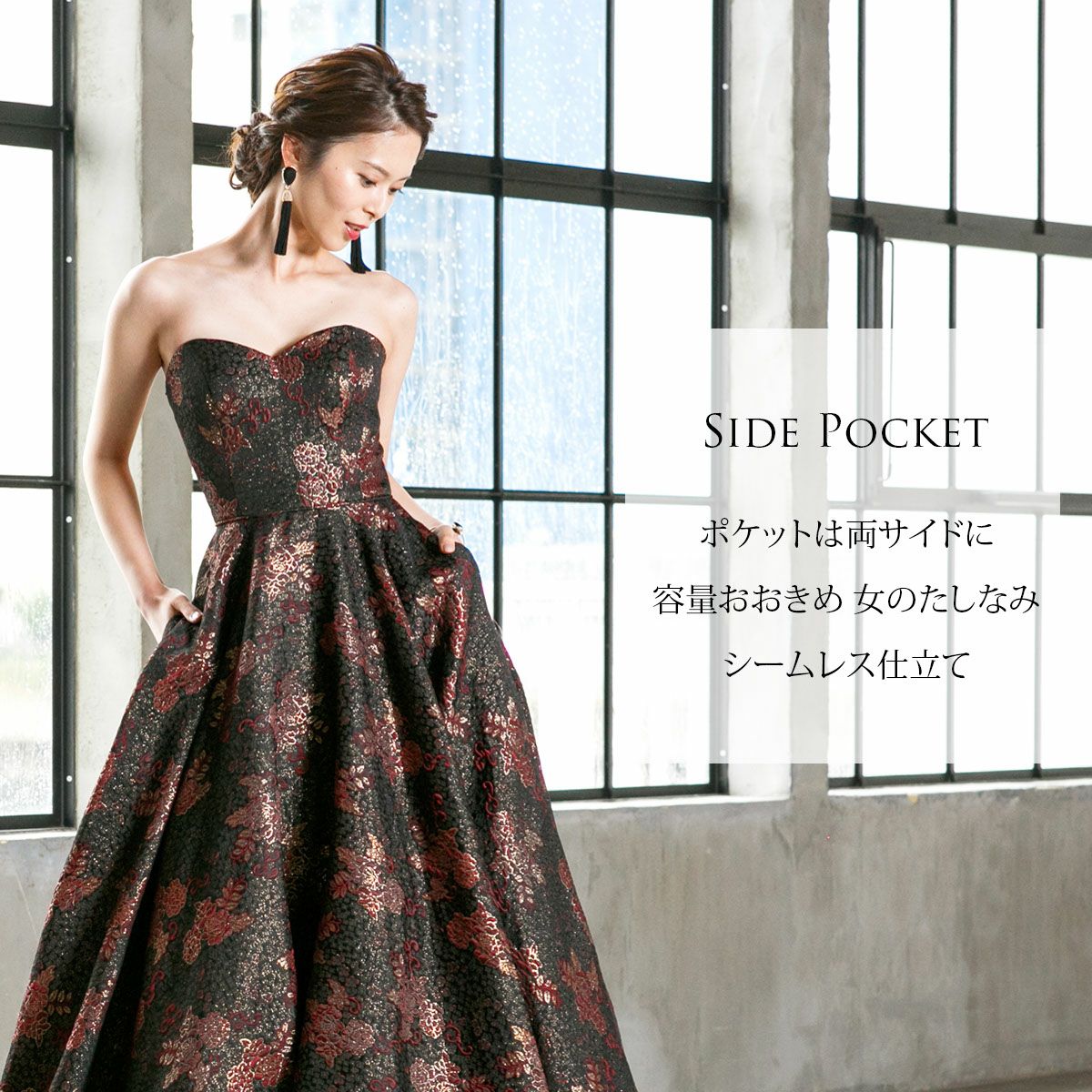 胸元バストライン、縦に入った2本のボーンとパットで綺麗なデコルテラインに仕上がってます。スカート部分は裏地・ハードチュール(パニエ)・表地の3枚。両サイドに手のひらサイズのポケット付き。演奏会・コンサート・ステージ衣装として最適なロングドレスです。