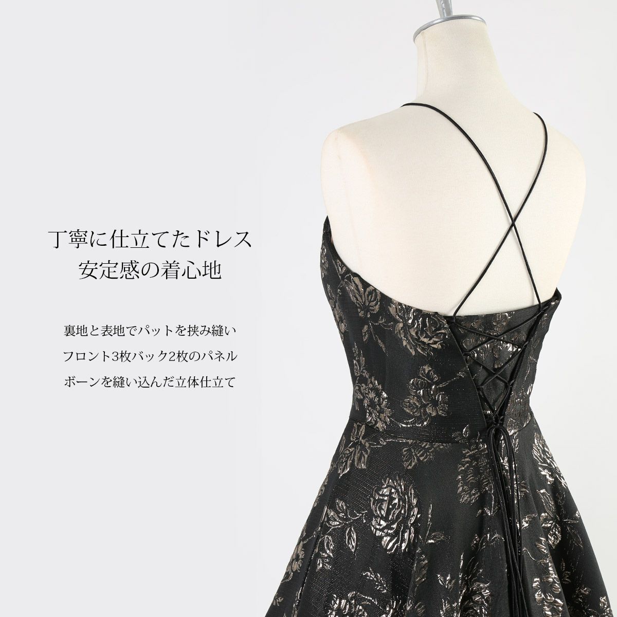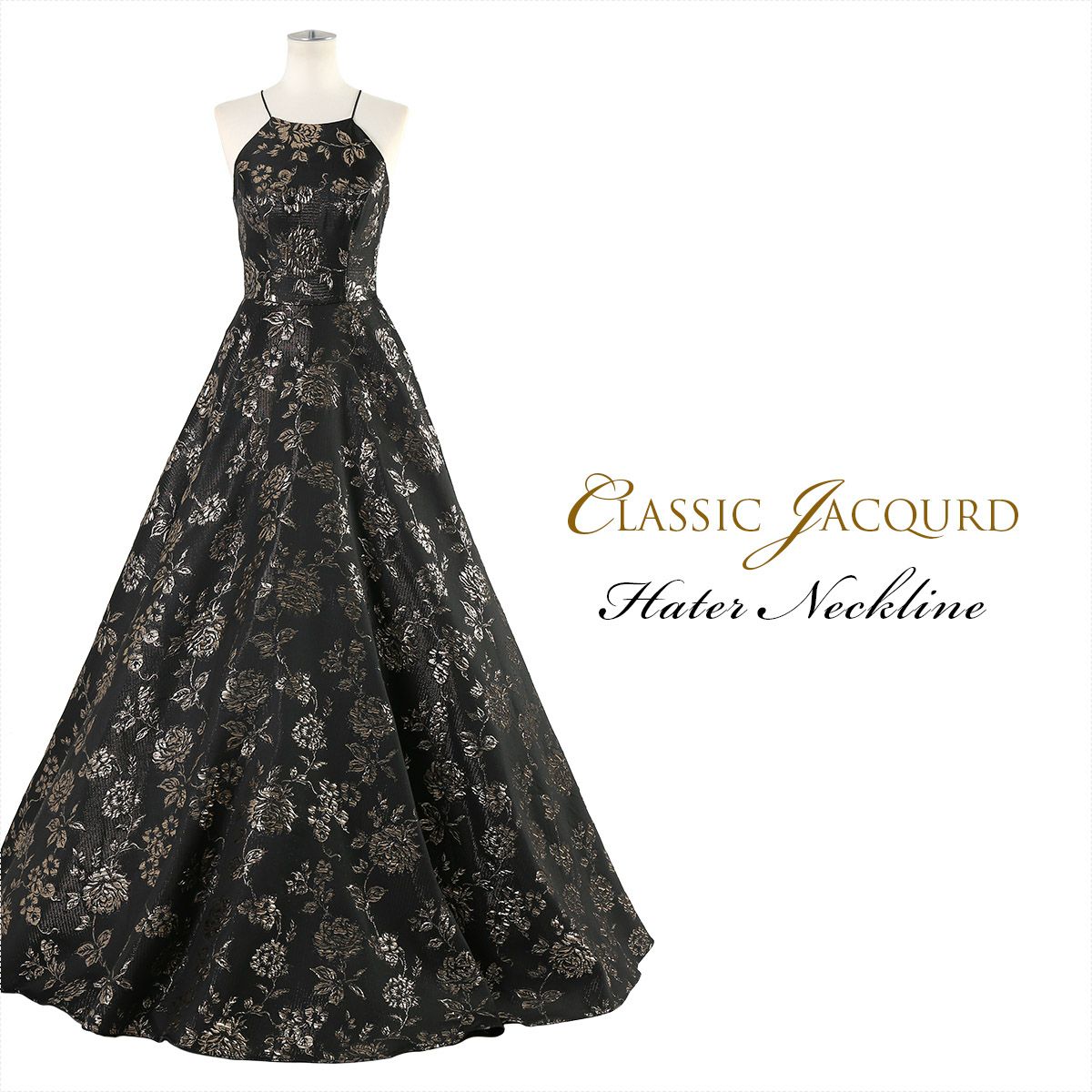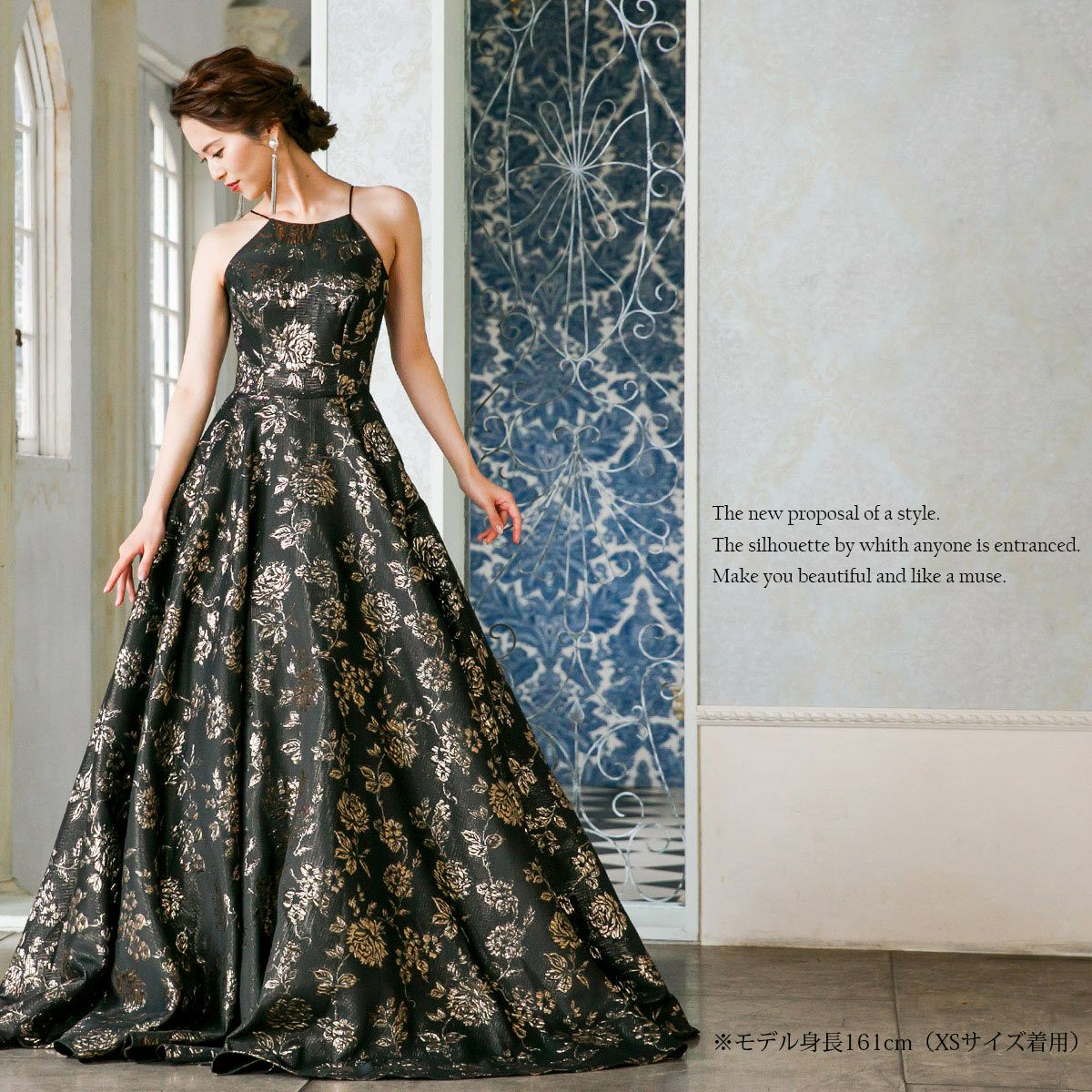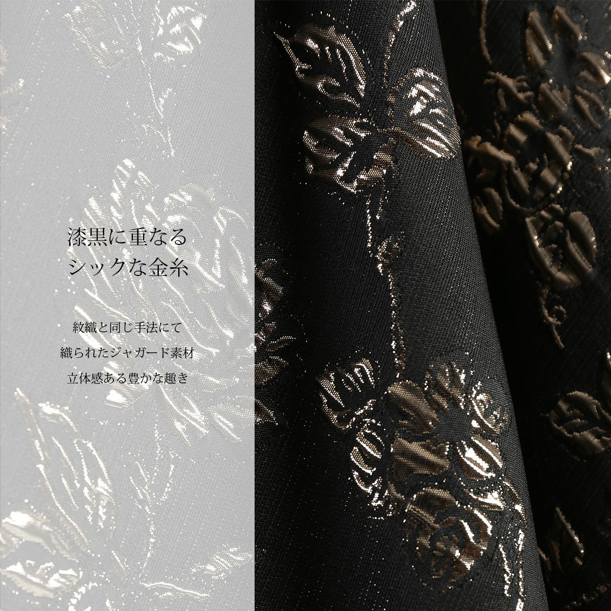 黒糸と金糸を紋織と同じ手法にて製作した織り物、ジャガード素材のロングドレス。金糸にて柄織りしたお花のモチーフ部分はほんのり立体感があり高級感ある佇まい。プリントとは違う深みのある上品な輝きに。