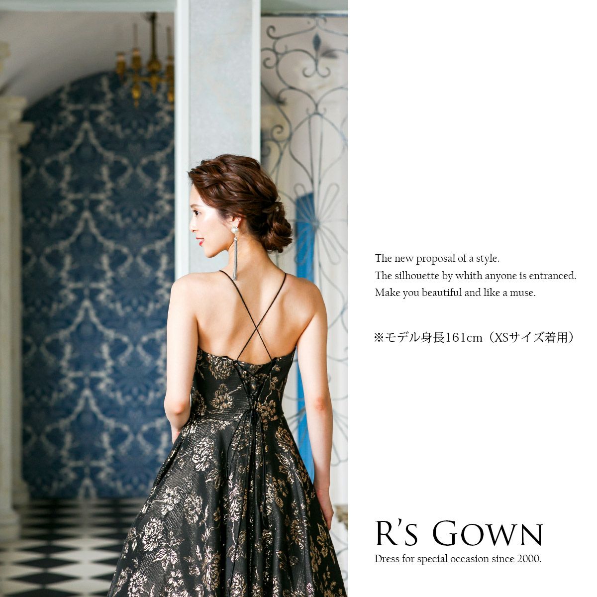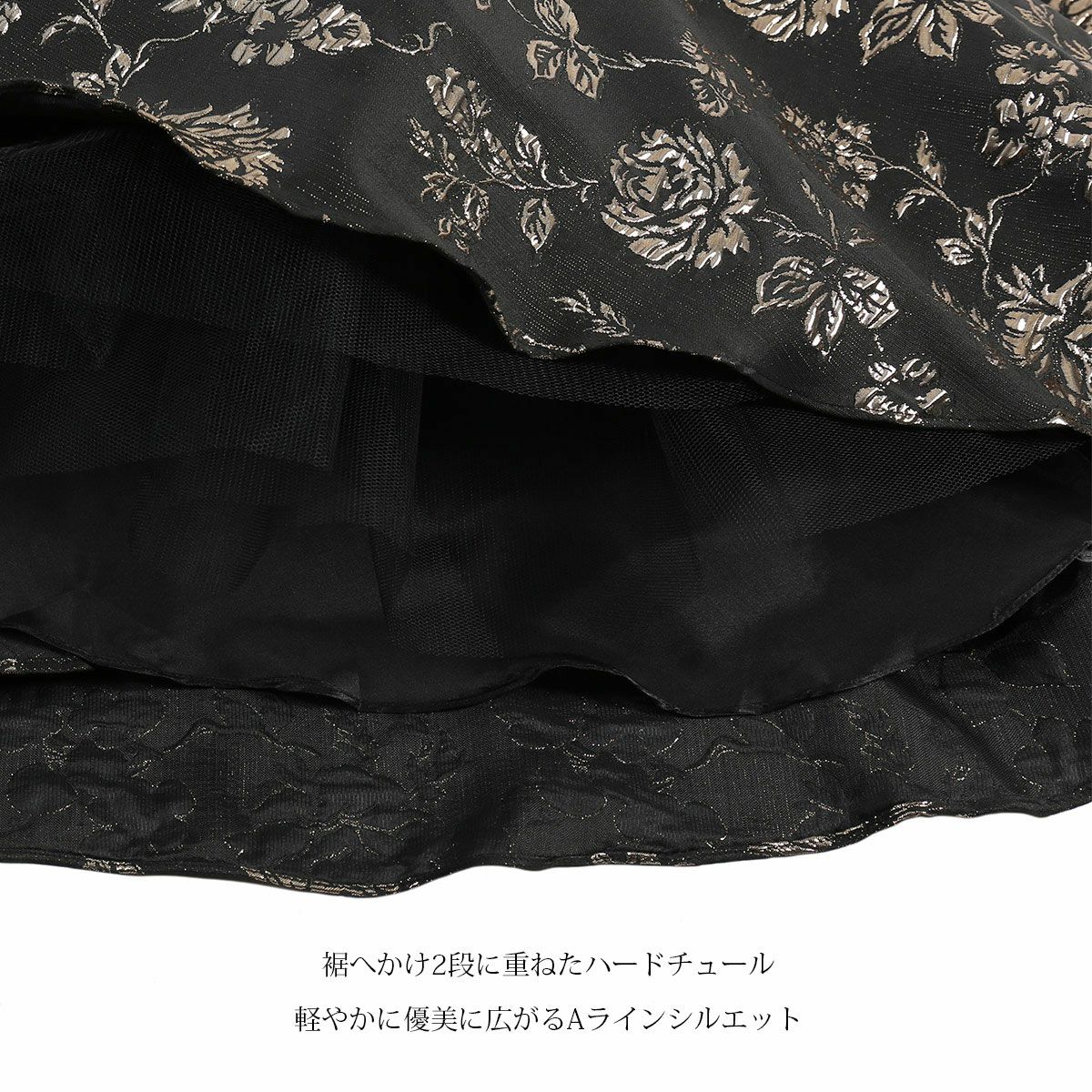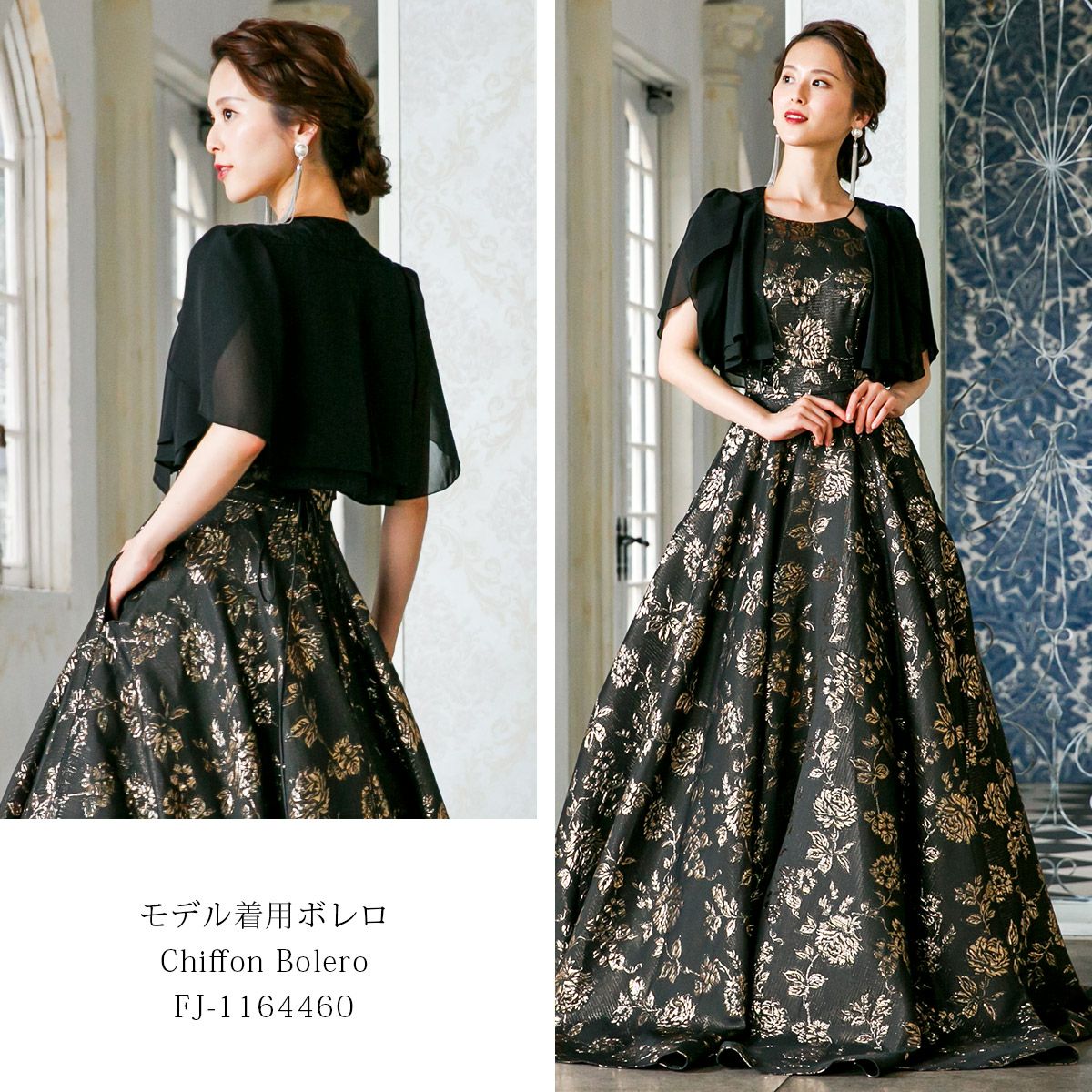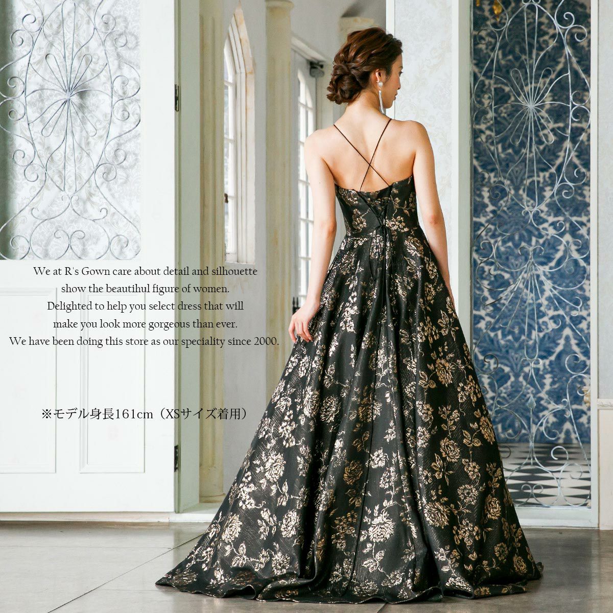 黒糸と金糸を紋織と同じ手法にて製作した織り物、ジャガード素材のロングドレス。金糸にて柄織りしたお花のモチーフ部分はほんのり立体感があり高級感ある佇まい。プリントとは違う深みのある上品な輝きに。