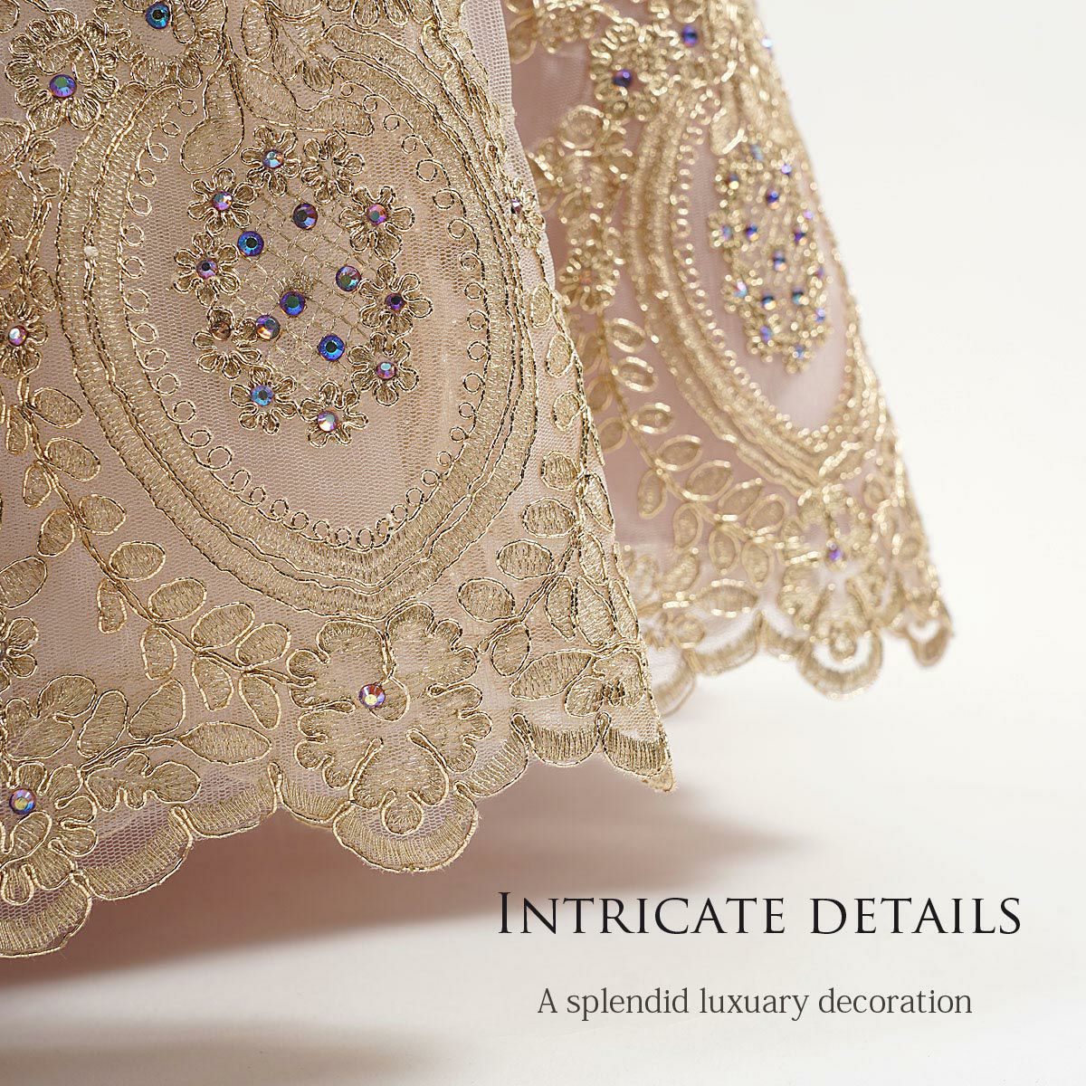 細やかな技法で張り巡らされたコード刺繍。デコルテラインよりウエストにかけ前後、袖のサイド、裾のエッジを縁どる。金糸のコード刺繍上に重ねた無数のビジューが幻想的な佇みをお約束。※ビジューは手作業にて1つ1つグルー(装飾用のり)にて装飾されております。ドレス商品の特性上、着用時に取れてしまう場合もあります。ビジューはランダムに装飾されていますので手芸用のりなどで補修が可能です。
