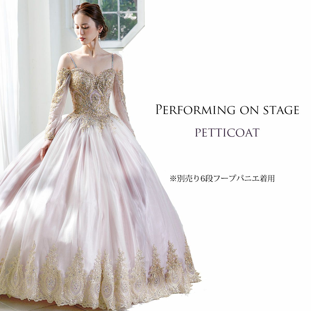 スカート内側へペチコートを2層重ねて縫い合わせ。プリンセスラインの理想的なシルエットを360度。※モデル着用画はドレスと一緒に" 6段フープパニエ "を着用。10cm程着丈が上がった状態です。