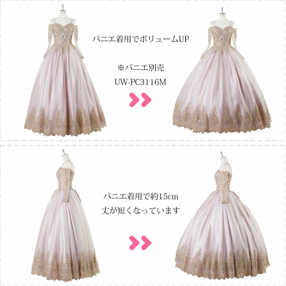 裾に装飾がある為、裾直しをお受けできません。着丈の調整には、別売りのパニエを更に使用する事で10~15cmほど短く調整できます。
