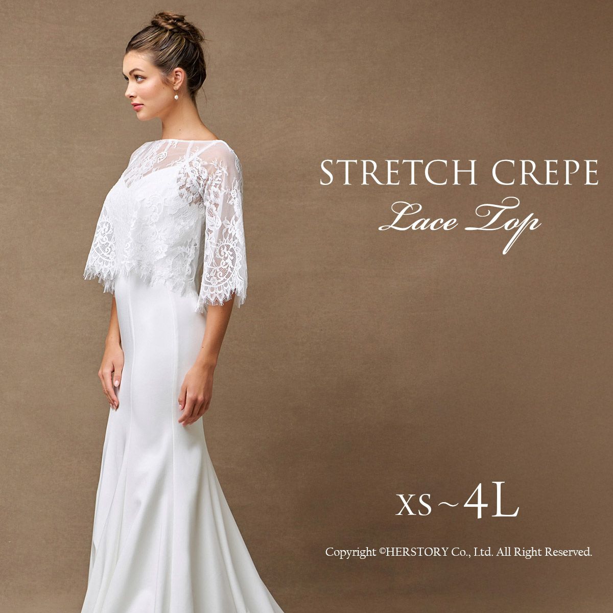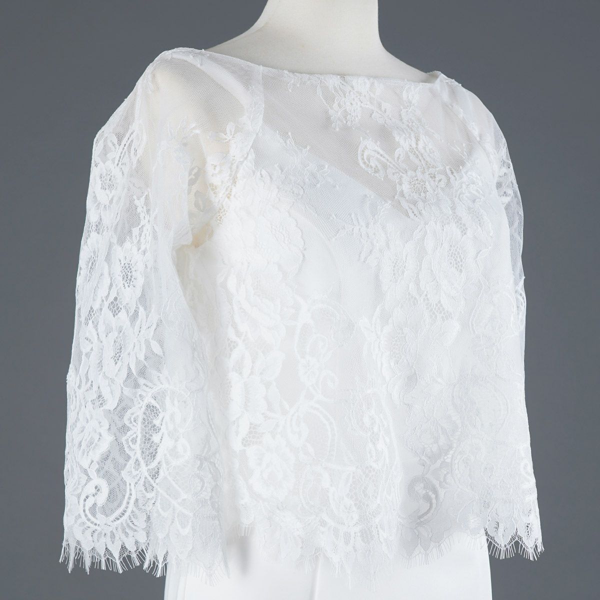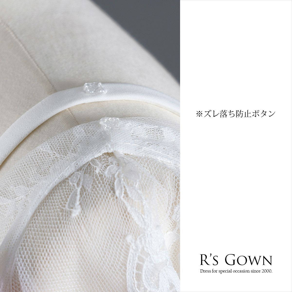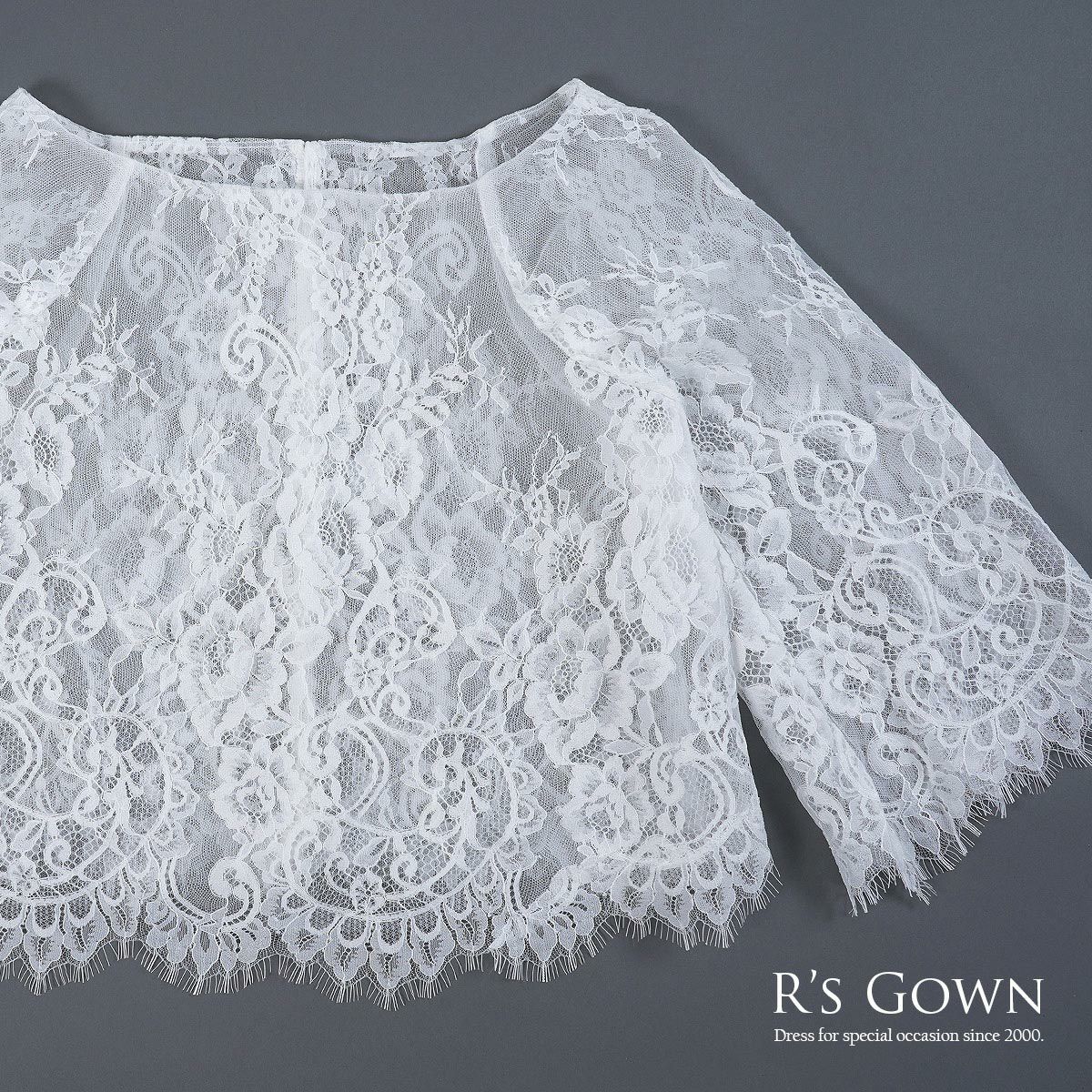 ヘルシーな肌見せで優しい印象にしてくれるレーストップス。ボートネックの首元でそのまま脱ぎ着できるゆったりめの作り、くるみボタンは実際に外せますのでヘアセットした後でも脱ぎ着が出来ます。ドレス・ストラップにスナップボタンがあり、トップスとドレスを留めます。