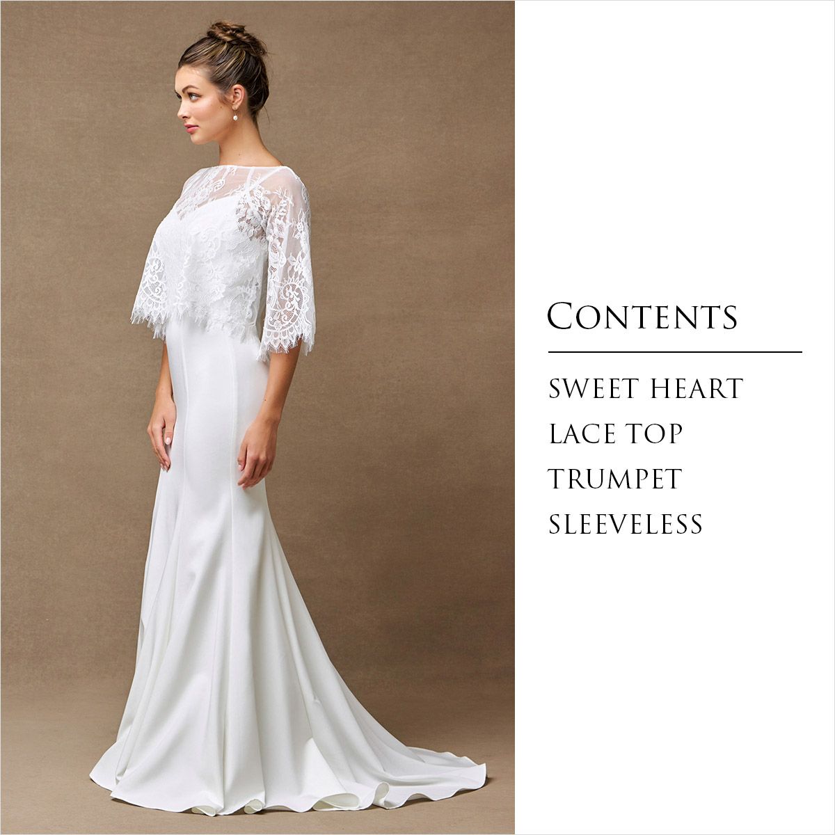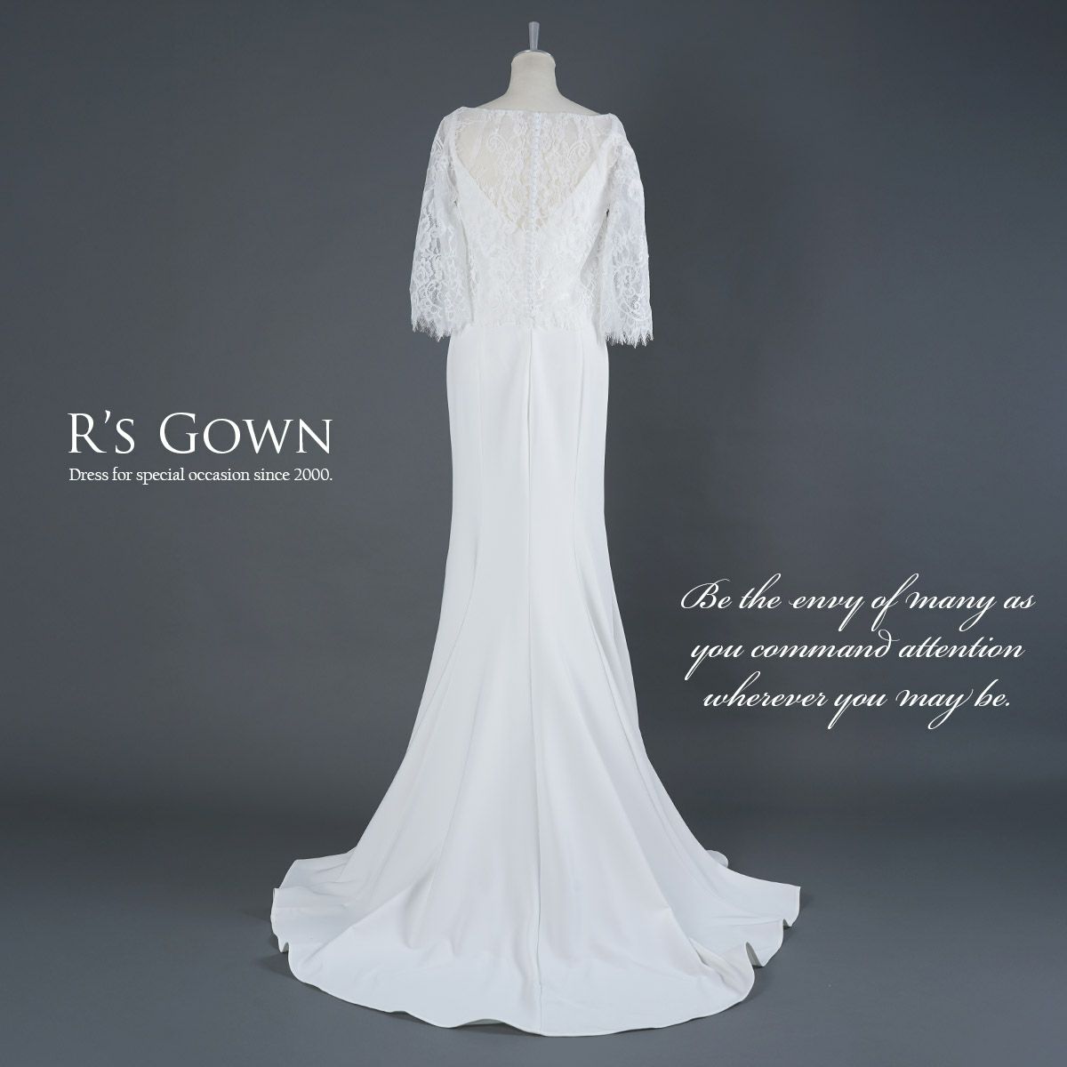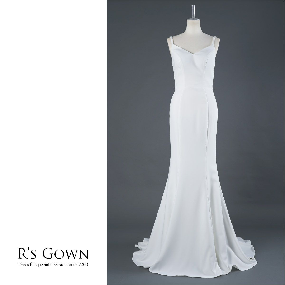 シンプルでありながら計算されたフォルムのトランペットマーメイド。ひざより高い位置から裾へかけ広がるシルエット、後ろトレーンへとつながり長く見せるトレーンが足を長く見せ視覚効果でほっそり見せ。しっとり柔らかなストレッチクレープ素材で優しく身体をホールド、デコルテラインは緩やかな曲線が弧を描くハートカット。パット・前後4本のボーンを配し、安定した着心地とシルエットに。