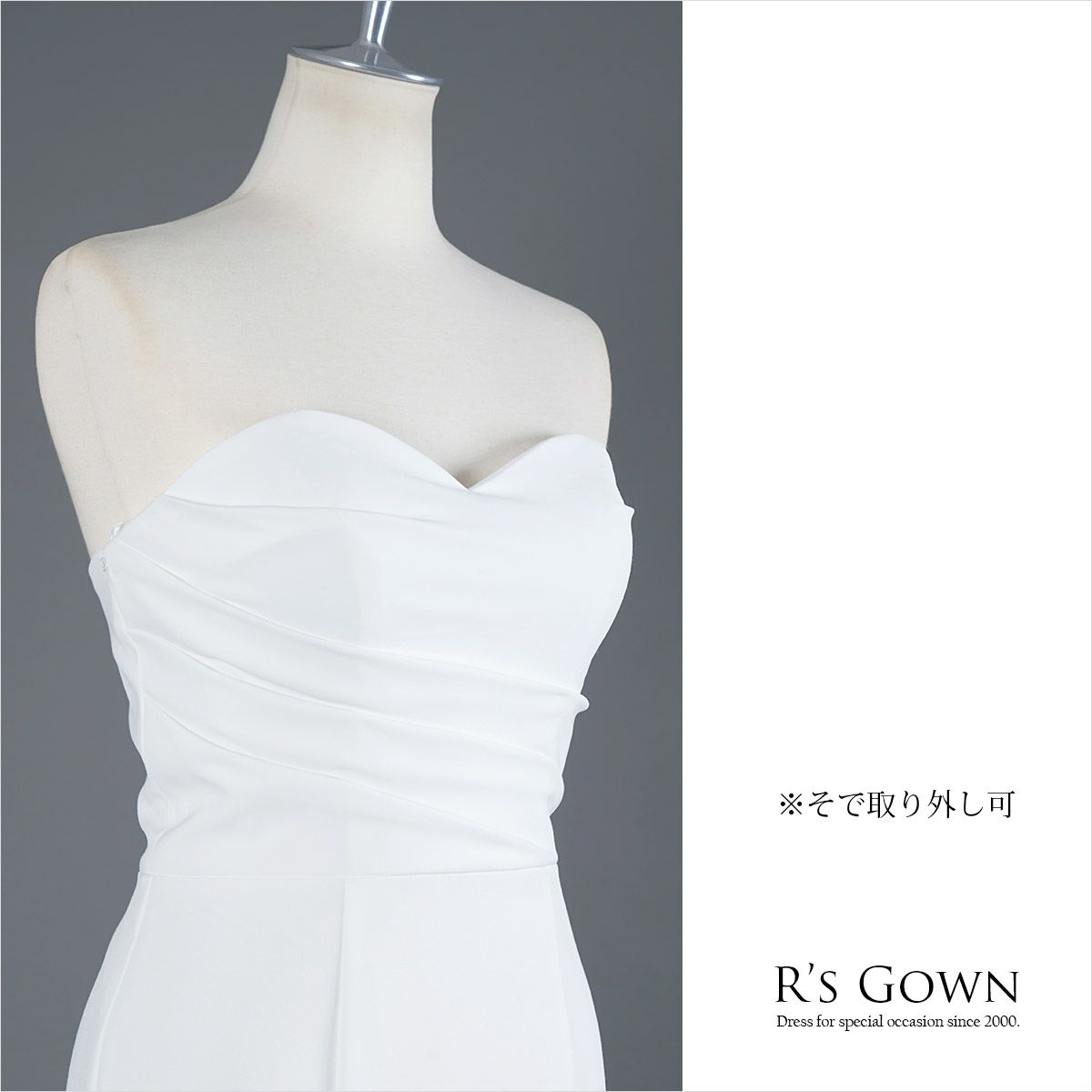 しっとりし肌当たりで優しく伸びるストレッチサテン生地を使用。胸元で柔らかな弧を描くハートカット、流れるように重なるプリーツ。胸パット内蔵、内側に4本のボーン配し、安定した着心地に仕立てたビスチェドレス。高い位置から裾へかけ広がるシルエットは腰の位置を高く見せ、後ろトレーンへとつながりクラス感のある佇まい。裾エッジには幅広で弾力のあるボンネットを配し美しいマーメイドのシルエットを形成。