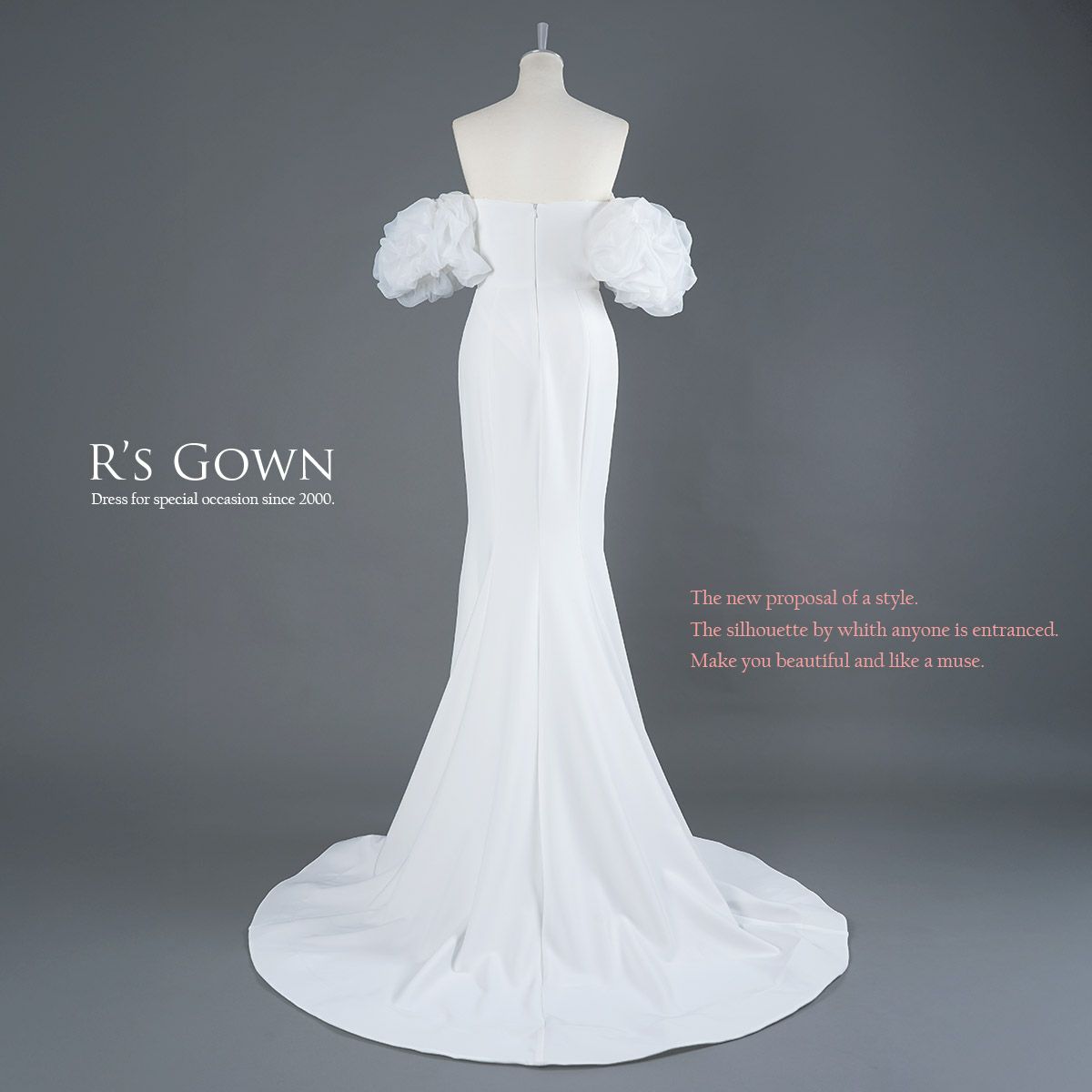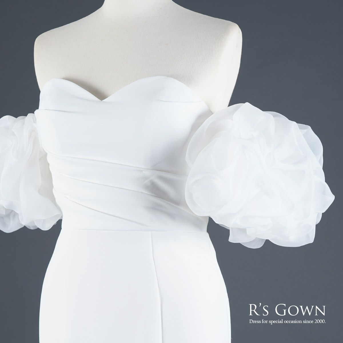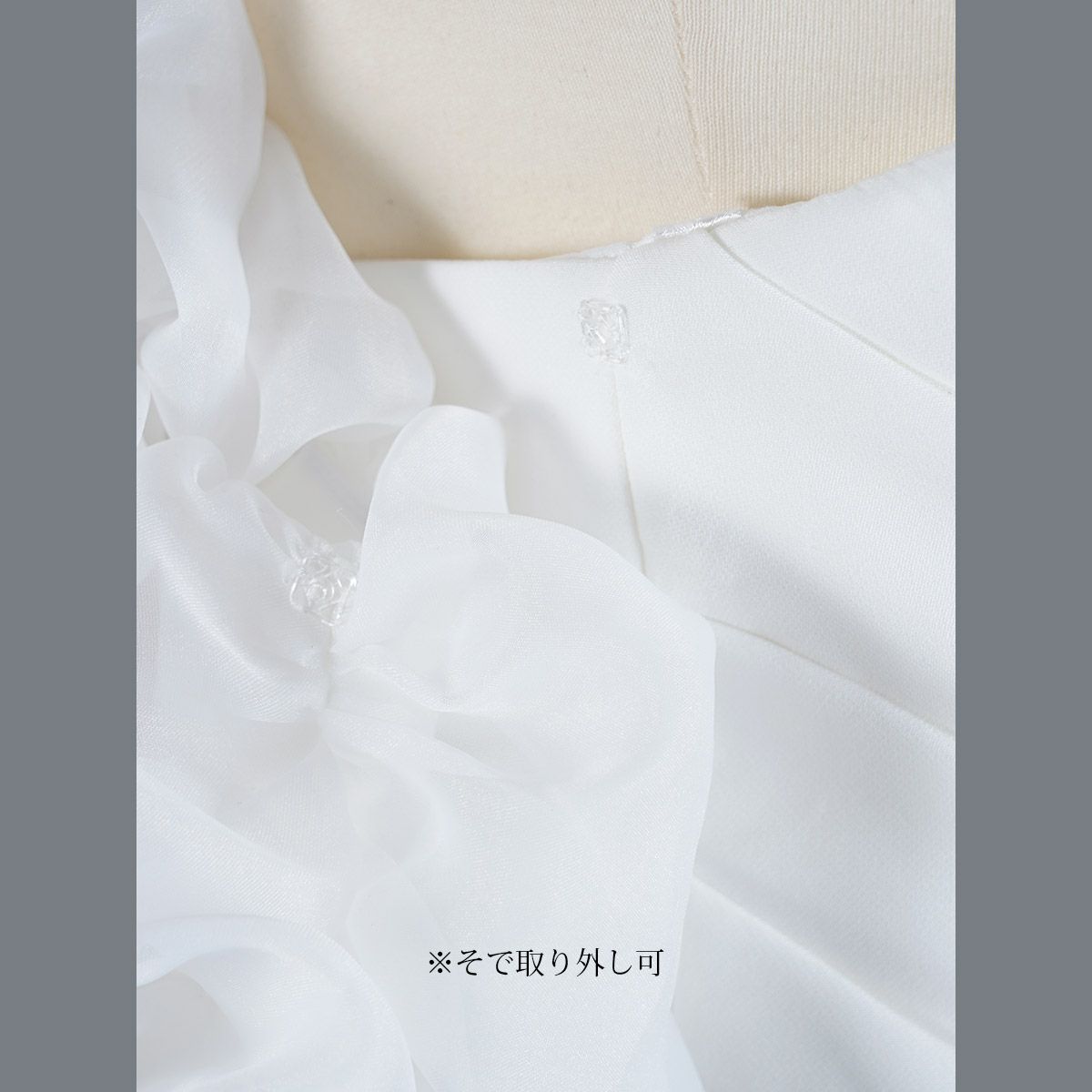 大きなオフショルダーのパフスリーブ(袖)は着脱可、ドレスとは異素材の” オーガンジー "を使用。薄紙のような繊細な輪郭、シアーで上品なシルエットを作ります。大きく立体的に作られたパフが二の腕をすっぽりカバー、可憐なうしろ姿を描きます。ストレスのない軽量素材、内側に平ゴムを配し安定感をサポートします。パフスリーブはドレス脇下のスナップボタンで留め外しします。