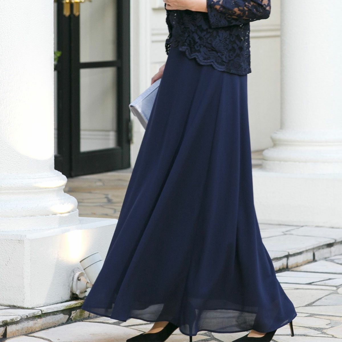レースをオーバーレイした一体型のワンピース。すこし高めのウエスト位置で切替えたシルエット。広がるフレアースカートにはしっとりとした落ち感のシフォンを使い、歩く所作が美しく見えるフレアーシルエットを作ります。