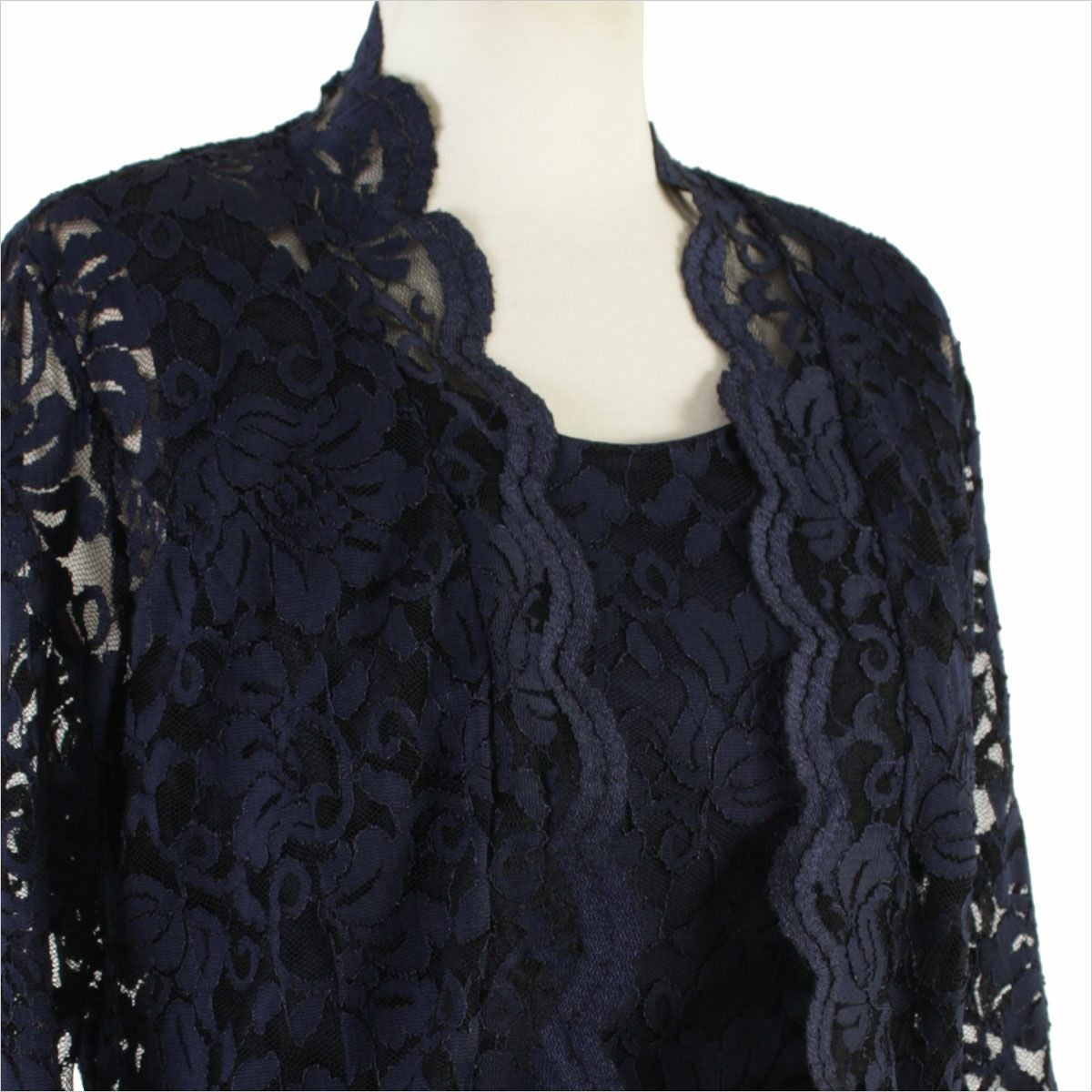 り、着心地は抜群で作る方の優しさを感じました。下着のラインや肉感も響きません。ぽっこりお腹やお尻も気にしていましたが、ハイウェストなのでスッキリ綺麗なラインのシルエットで嬉しくなりました。背中の開きですが、普通のブラ着用でブラが見えることはなかったです。着丈の直しが必要かと心配していましたが、身長161 cm、ヒール5cmで床上2~3cmで靴の先端が出るくらいでした。説明書きでも床上1~5cm程の長めの着丈でお召しいただくとより一層の品格がでるとのことなので、お直ししなくてよかったです。ジャケットもスカラップレースを使用した総レースのボレロで欲しかった首回りをすっきり見せるスタンドカラーでそれも◎。腕もいい着心地でレースが映えて綺麗です。