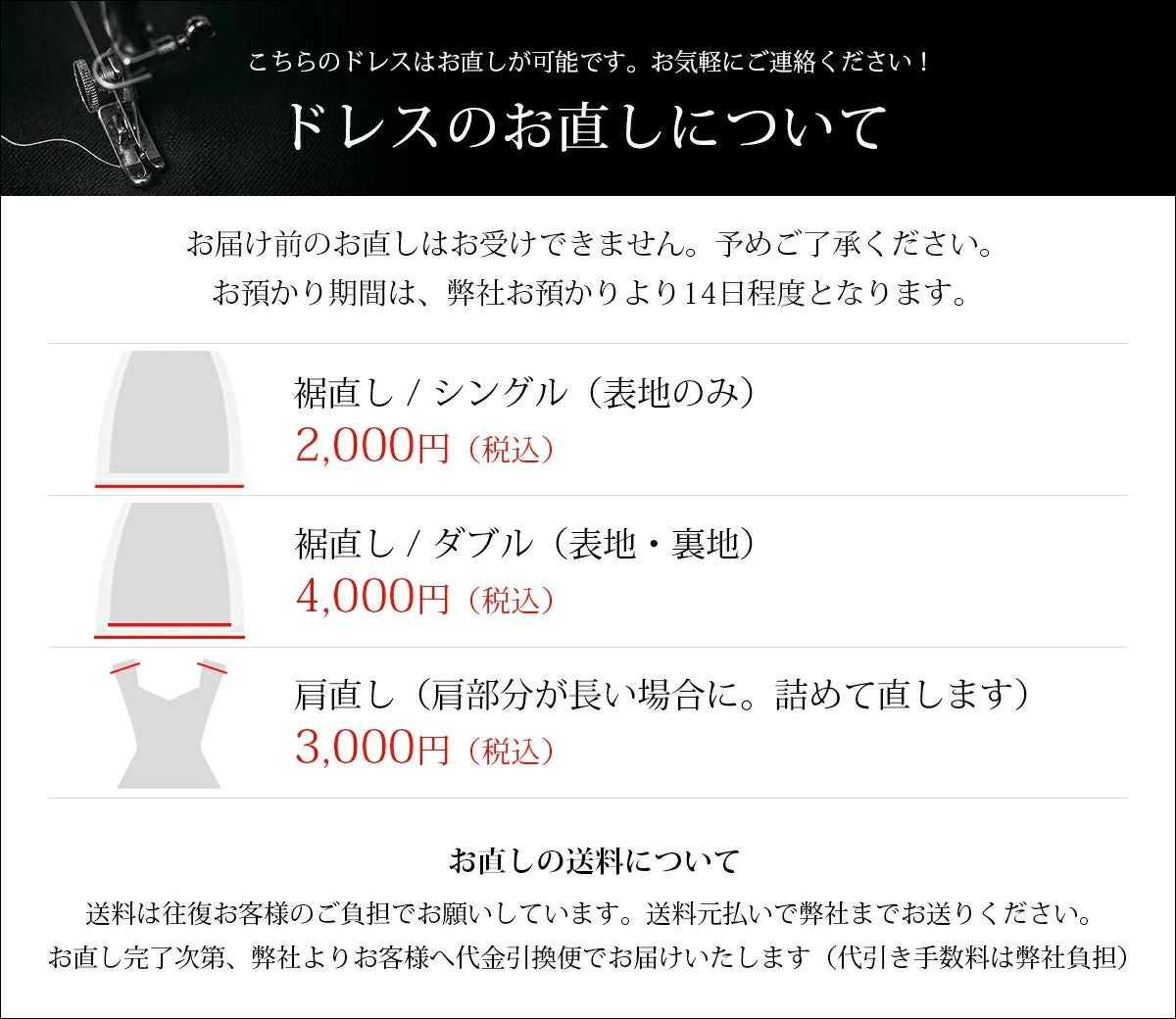 着丈は長めに作られております。床上1~5cm程の長めの着丈でお召しいただくとより一層の品格がでます。着用されるT.P.Oと身長に合わせご希望の着丈にお直しをお受けしております。身長・体格などにより着丈は変わりますので、ご試着前のお直しはお受けしておりません。急を要するご使用で着丈が長い場合など、簡易的な直しになりますが、ドレスのウエスト部分(レース内側)にベルトや紐、平ゴムなどを用いて着丈を調整する、また肩回りが浮く場合は手縫いでくくるなどして、若干の調整が出来ます。
