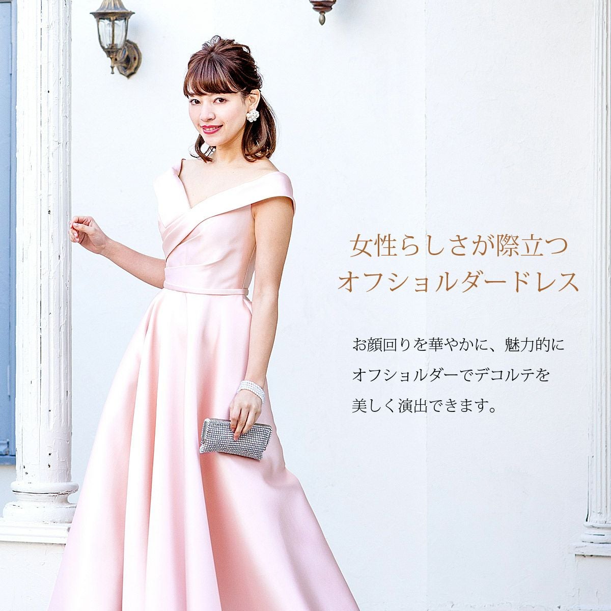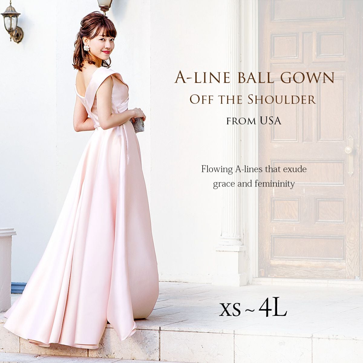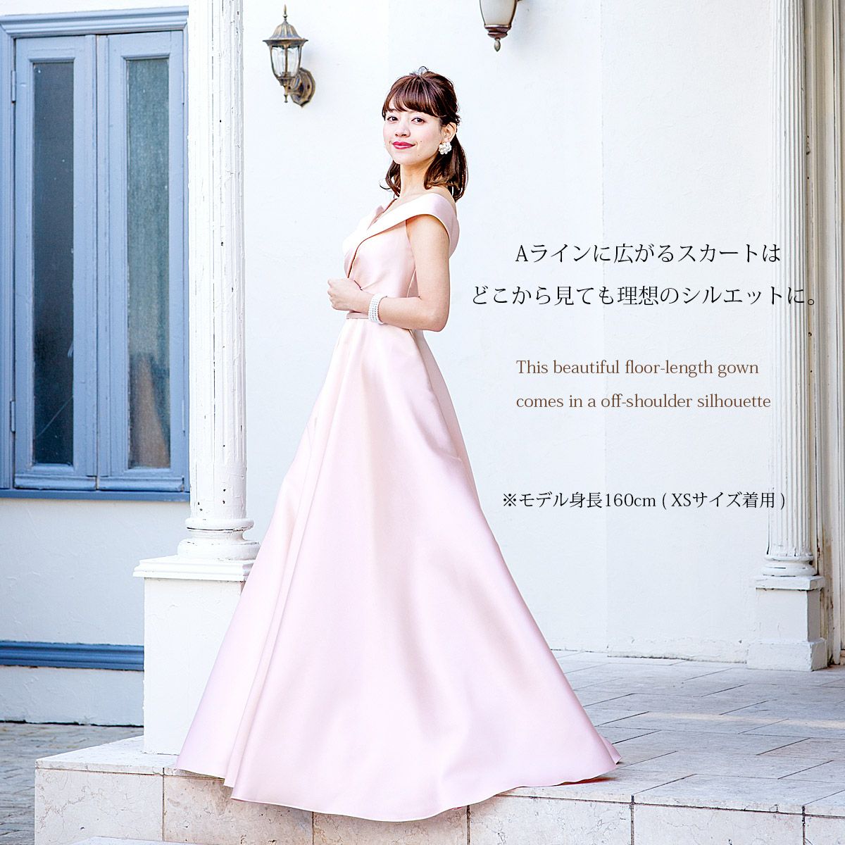デコルテのハートカットと曲線美、フォルムが印象的なオフショルダーAラインロングドレス。高級感のある柔らかな光沢は、大人の気品を引き立てます。