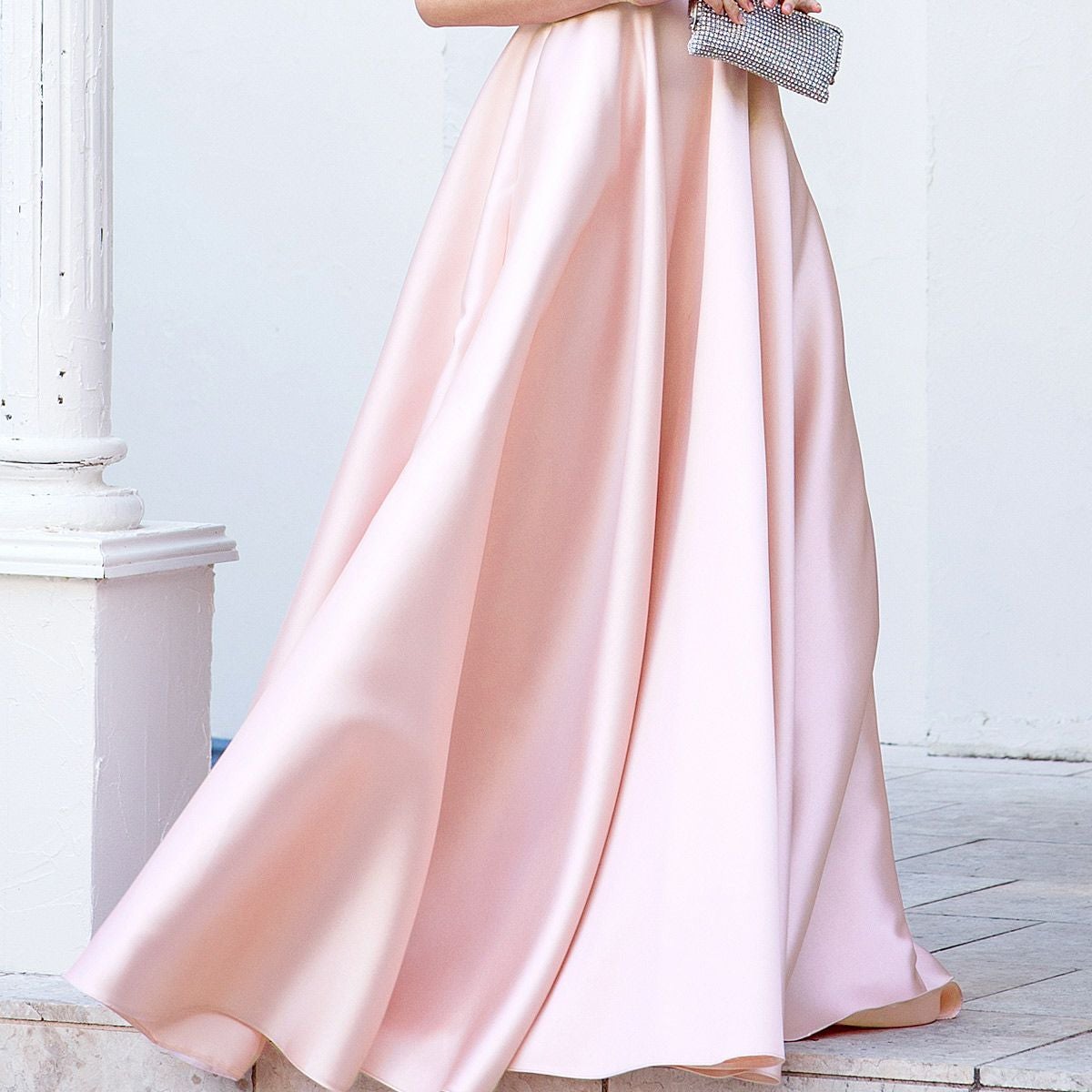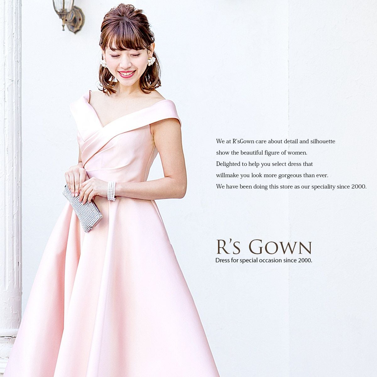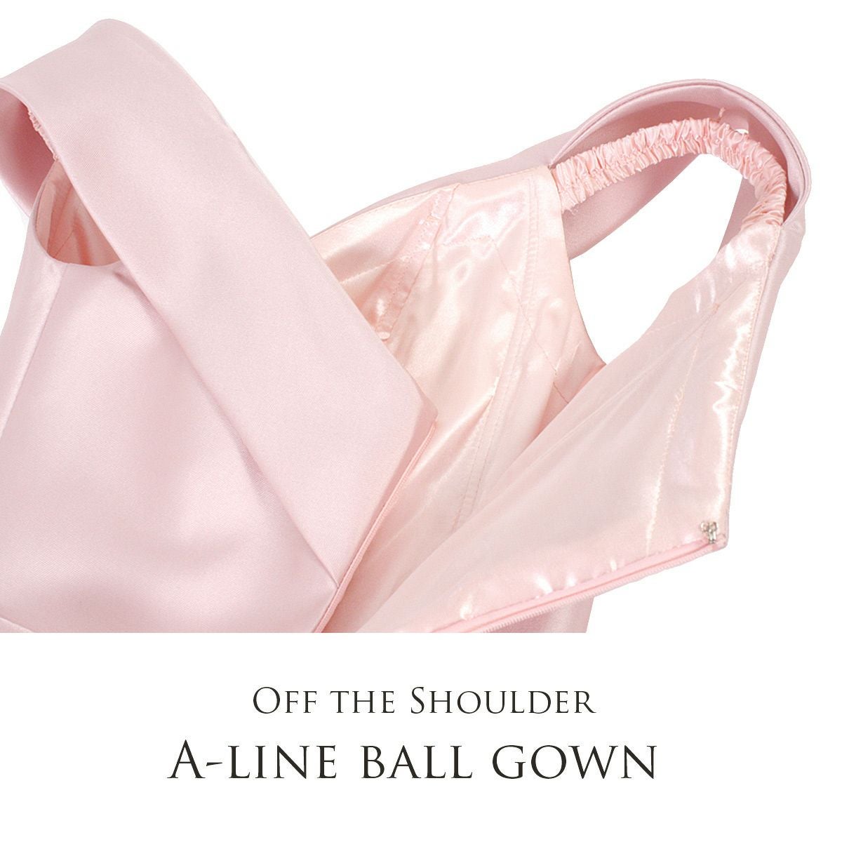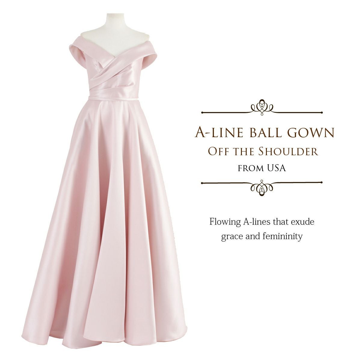 デコルテのハートカットと曲線美、フォルムが印象的なオフショルダーAラインロングドレス。高級感のある柔らかな光沢は、大人の気品を引き立てます。