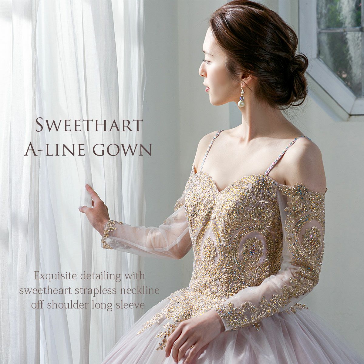 細やかな技法で張り巡らされたコード刺繍。デコルテラインよりウエストにかけ前後、袖のサイド、裾のエッジを縁どる。金糸のコード刺繍上に重ねた無数のビジューが幻想的な佇みをお約束。※ビジューは手作業にて1つ1つグルー(装飾用のり)にて装飾されております。ドレス商品の特性上、着用時に取れてしまう場合もあります。ビジューはランダムに装飾されていますので手芸用のりなどで補修が可能です。