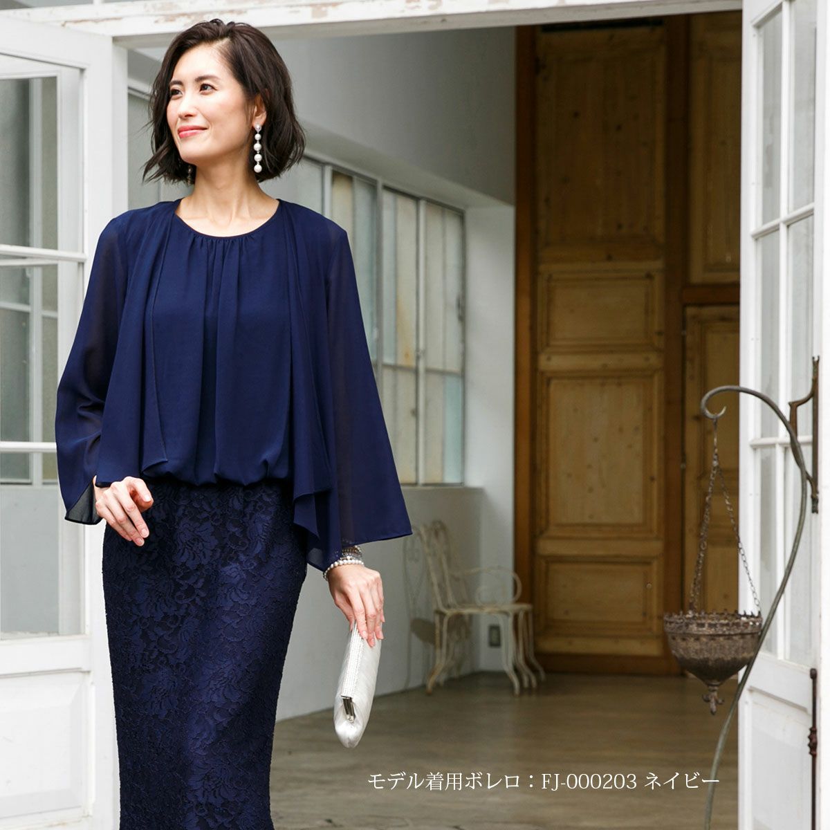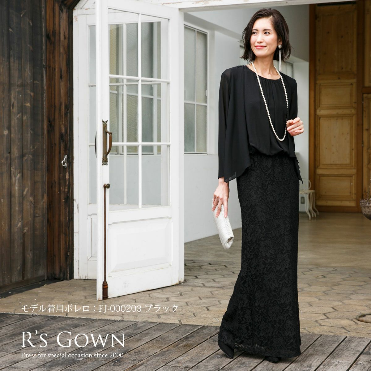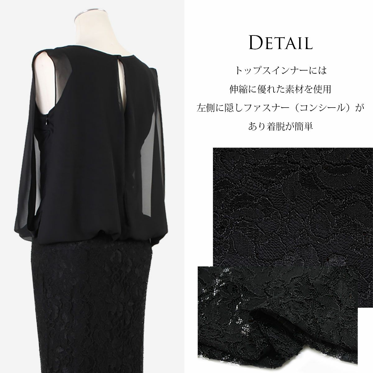 お着物のような印象をもつドレスバランスで流れるように縦に落ちるシフォンは縦の線を強調ウエスト周りを優しくカバー。スカートに使用した弾力のあるレースは上下にメリハリをつくり、マーメイドのシルエットは腰の位置を高く、膝下を長く見せます。地厚なレース柄が下着の線もカバーしますので普段の下着を着用頂けます。ひと繋ぎになっている一体型ワンピースのフォーマルロングドレス。