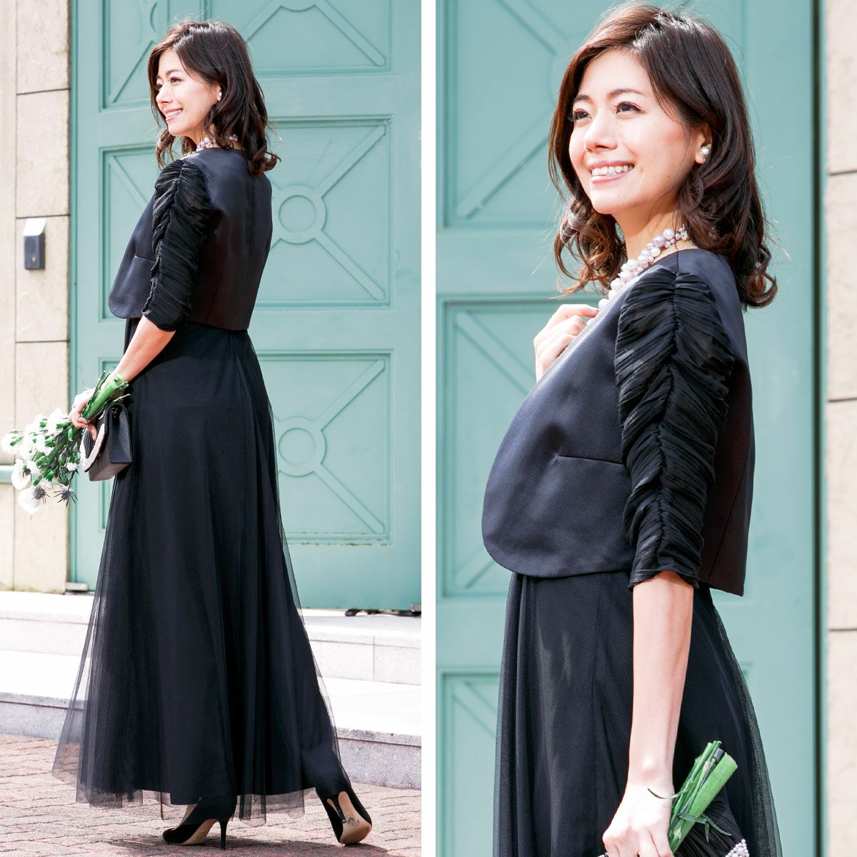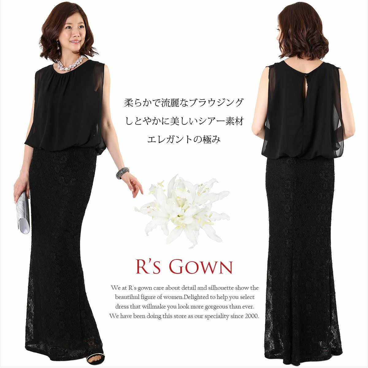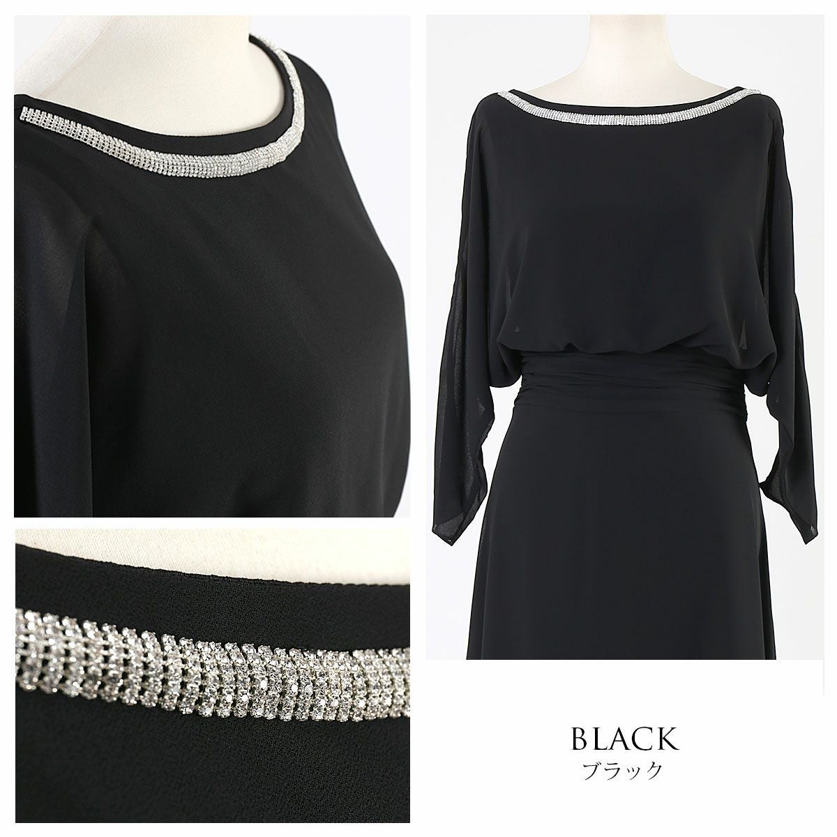 送料無料 パーティードレス フォーマルドレス ロングドレス 船上パーティー 発表会 30代 40代 50代 結婚式 母親 ドレス 演奏会 ブラック ブラウジング・ドレス シアースリーブ ロングドレス FD-050105
