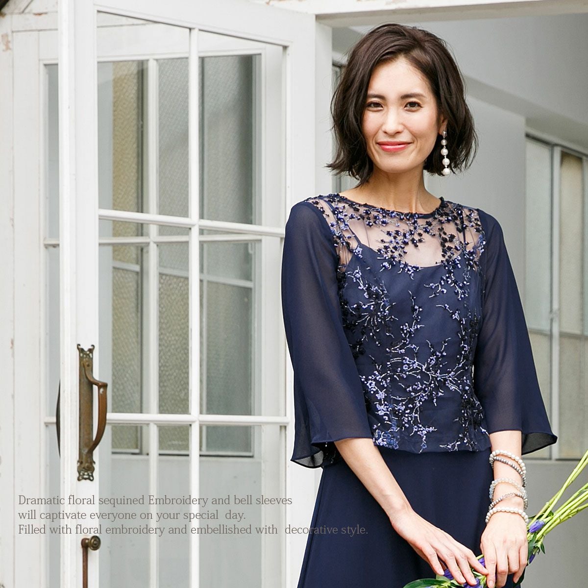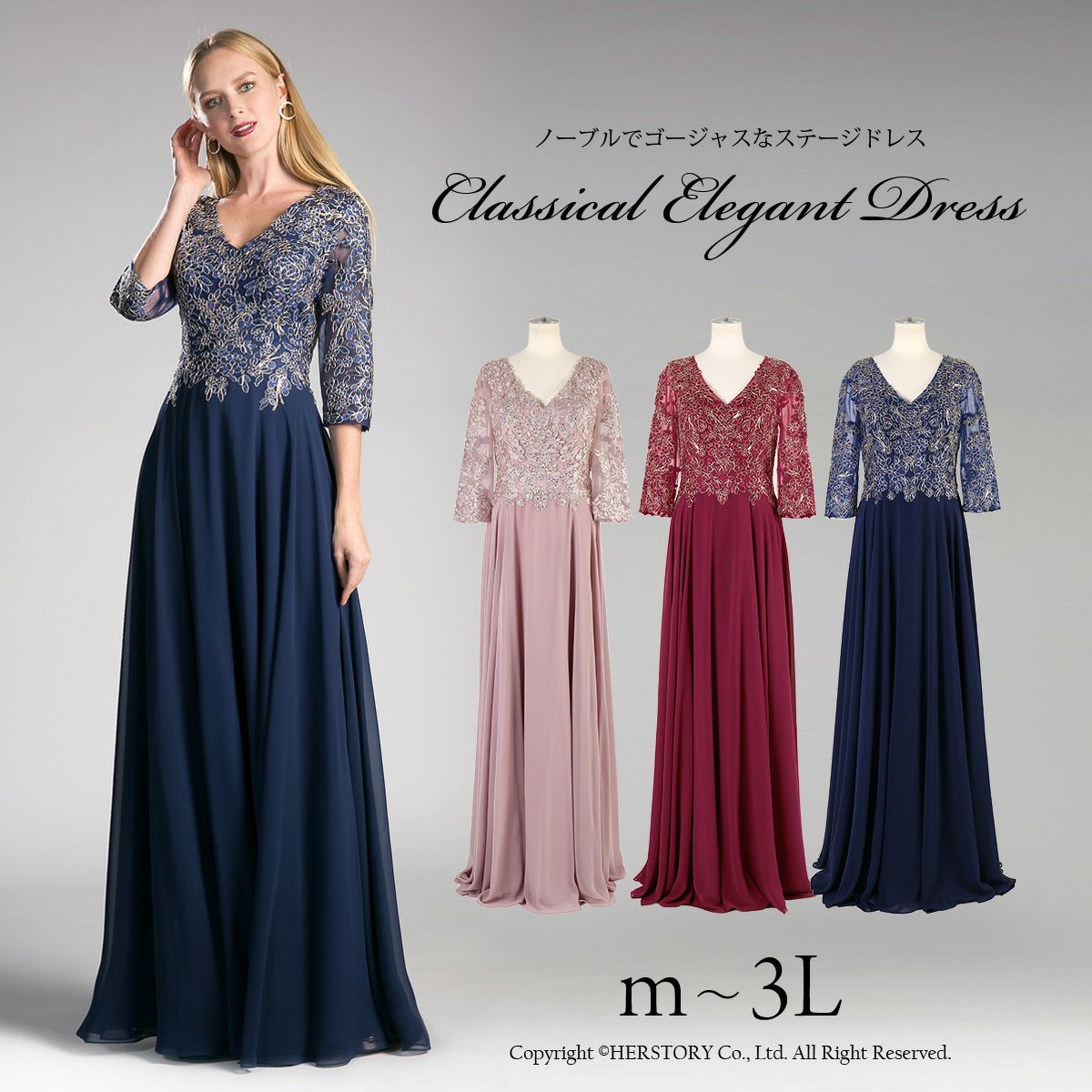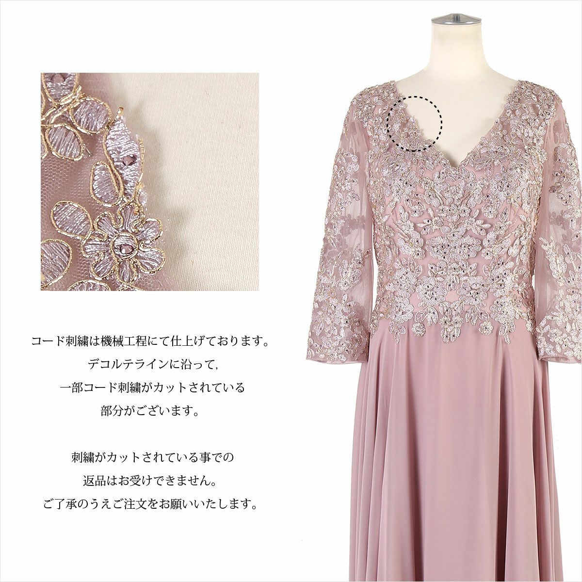 スレンダー M/L/LL/3L/4L ドレス 袖あり 長袖 刺繍が華やかな七分袖 ステージ ロングドレス FD-230034
