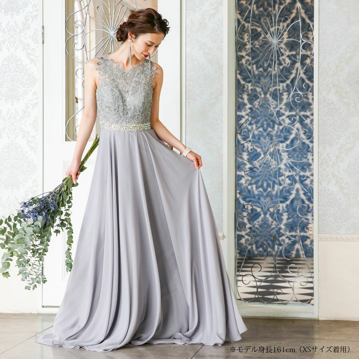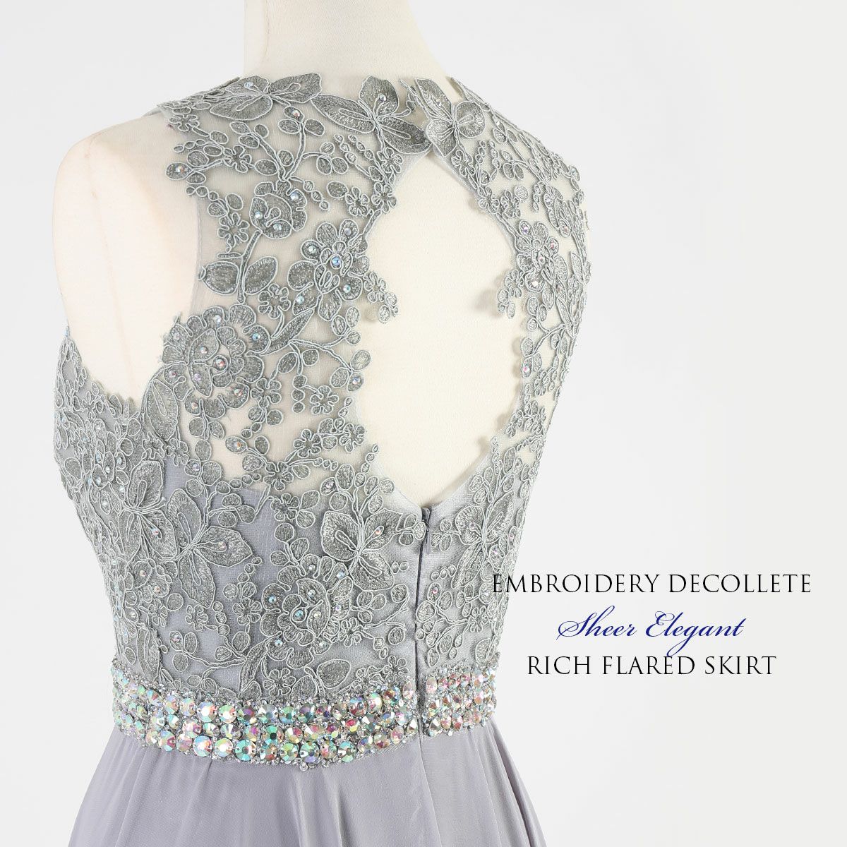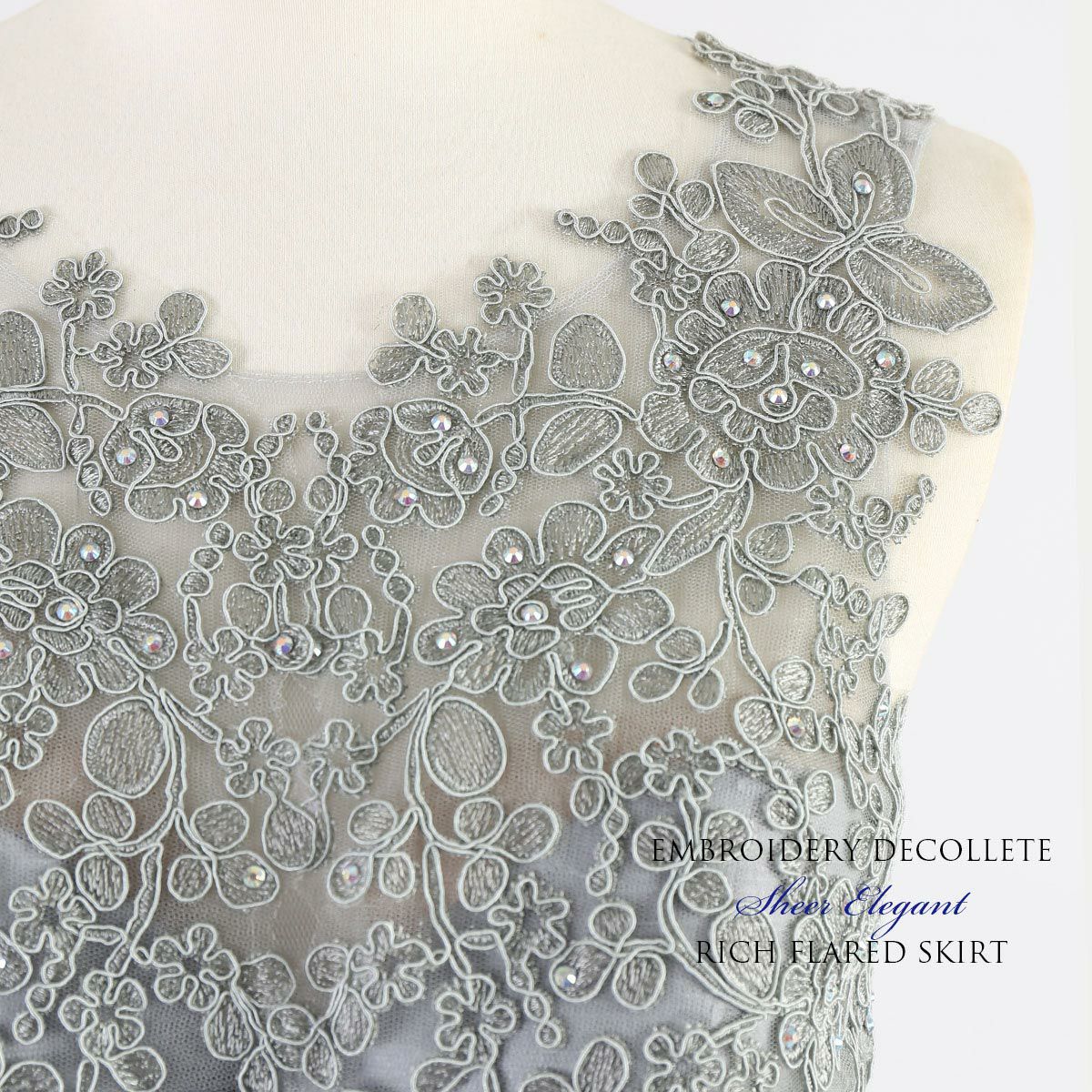 演奏会 発表会 大人 上質 上品 レースが神秘的!ライトグレーのロングドレス FD-260076
