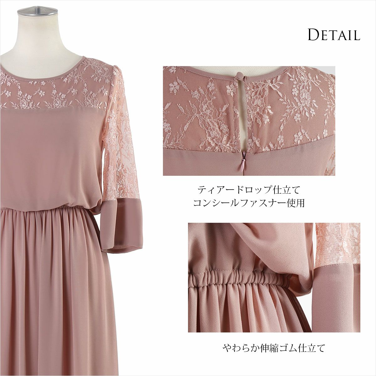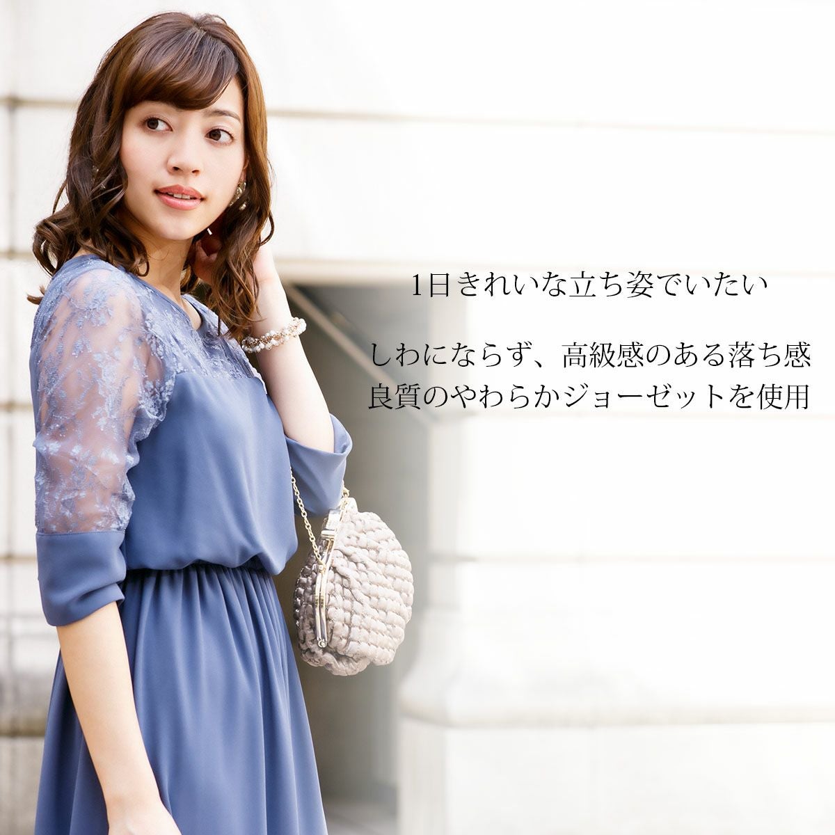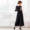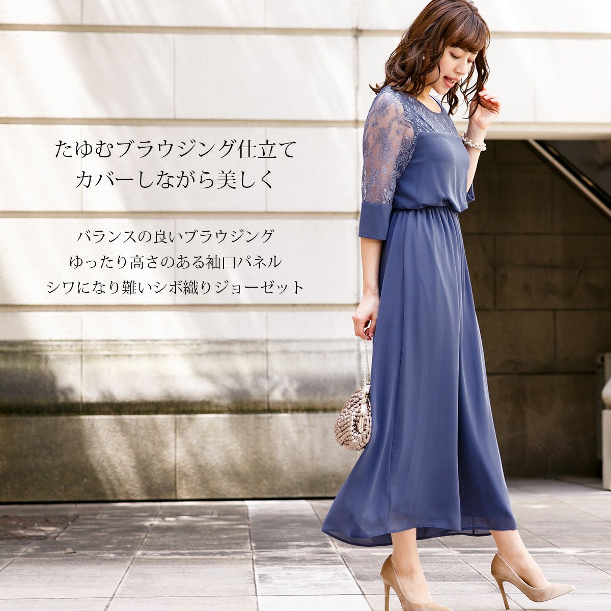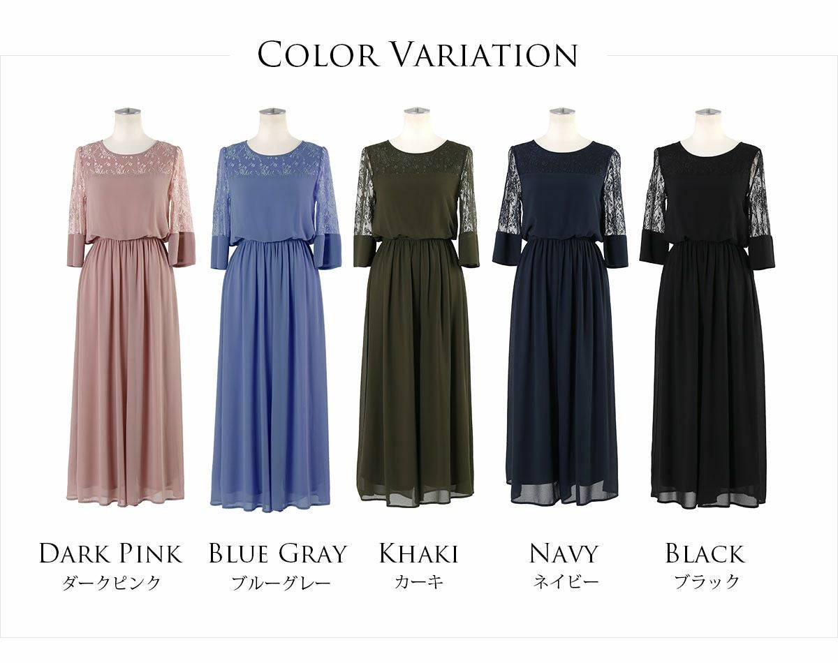 シワになりにくく、さらっとした肌触り良質のジョーゼット素材を使用。 ウエストは伸縮性に優れたゴム仕立てで快適な着心地。ハイウエストでスタイルアップ。 デコルテのパネルレース部分はシフォン素材の裏地付き。 透け感のあるレースの七分袖は、幅広のカフスがドレスのワンポイントに。