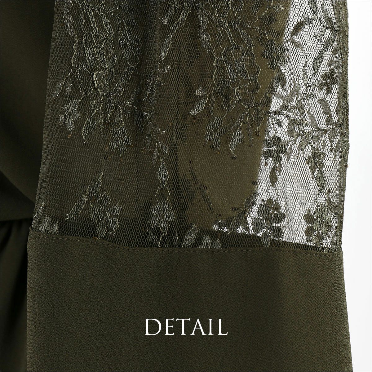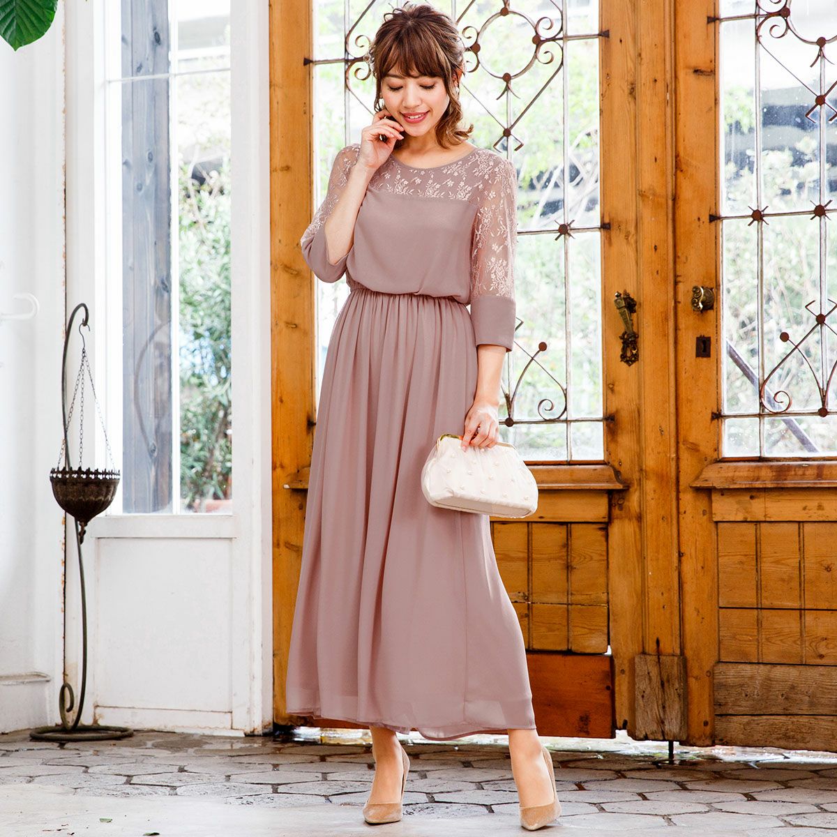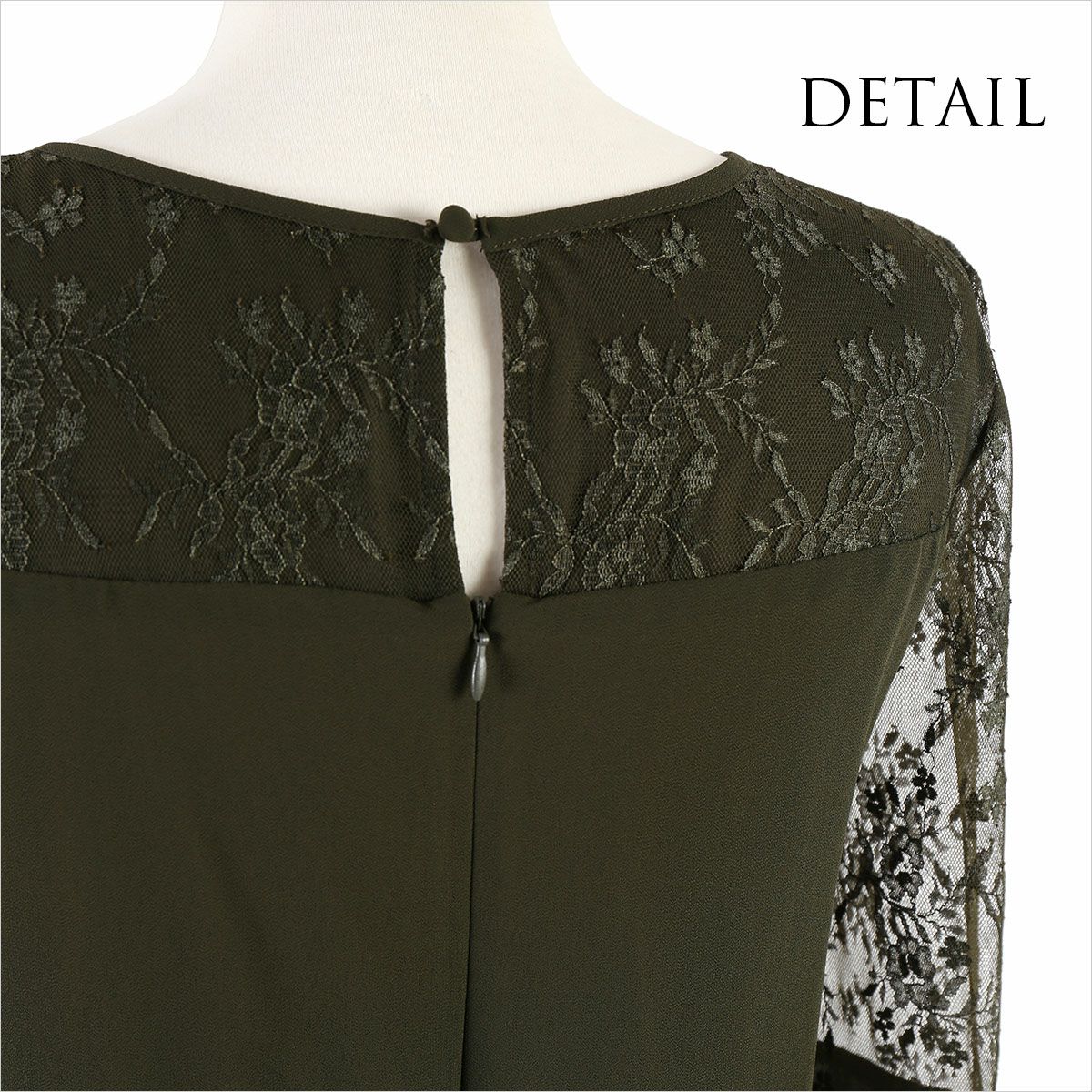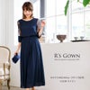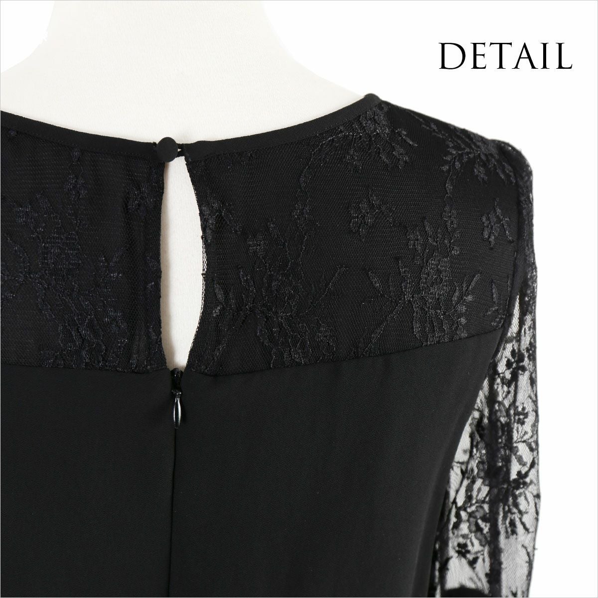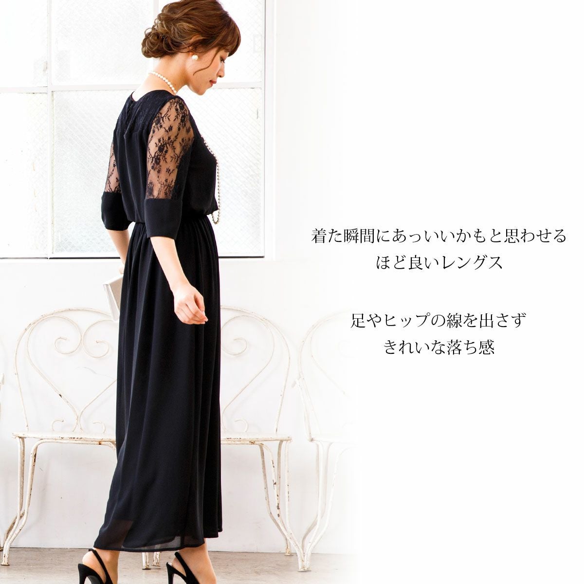 シワになりにくく、さらっとした肌触り良質のジョーゼット素材を使用。 ウエストは伸縮性に優れたゴム仕立てで快適な着心地。ハイウエストでスタイルアップ。 デコルテのパネルレース部分はシフォン素材の裏地付き。 透け感のあるレースの七分袖は、幅広のカフスがドレスのワンポイントに。