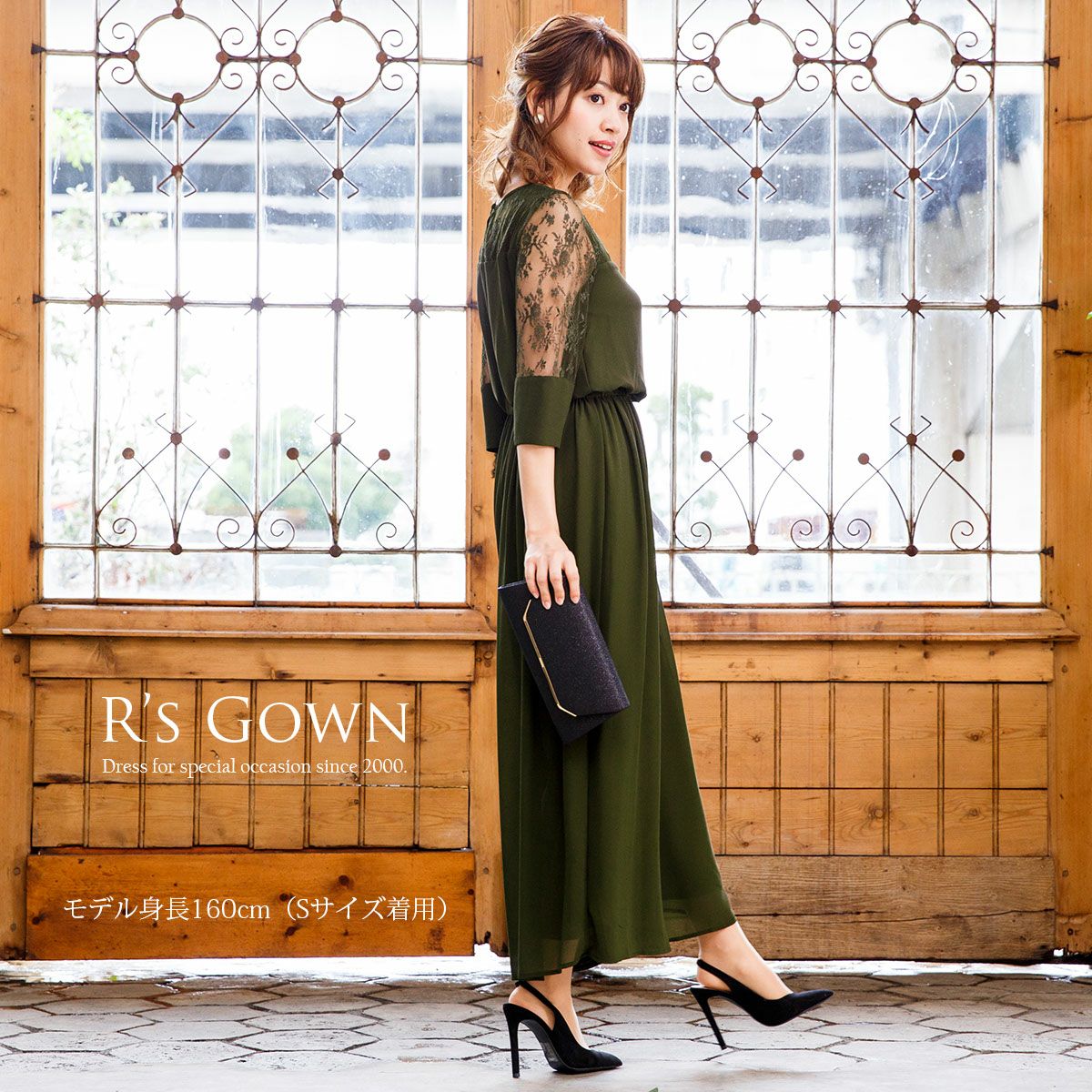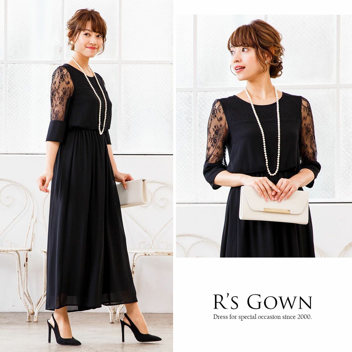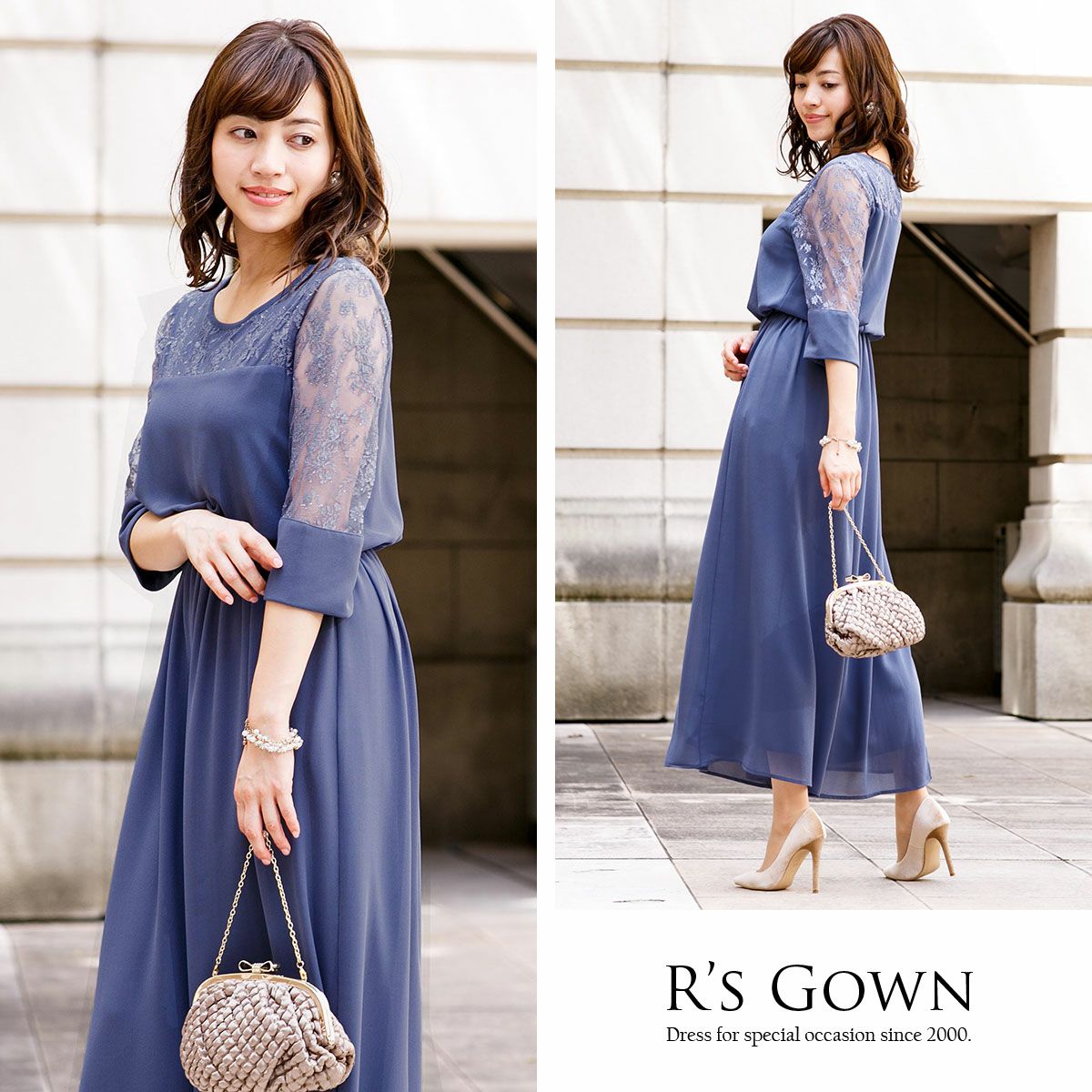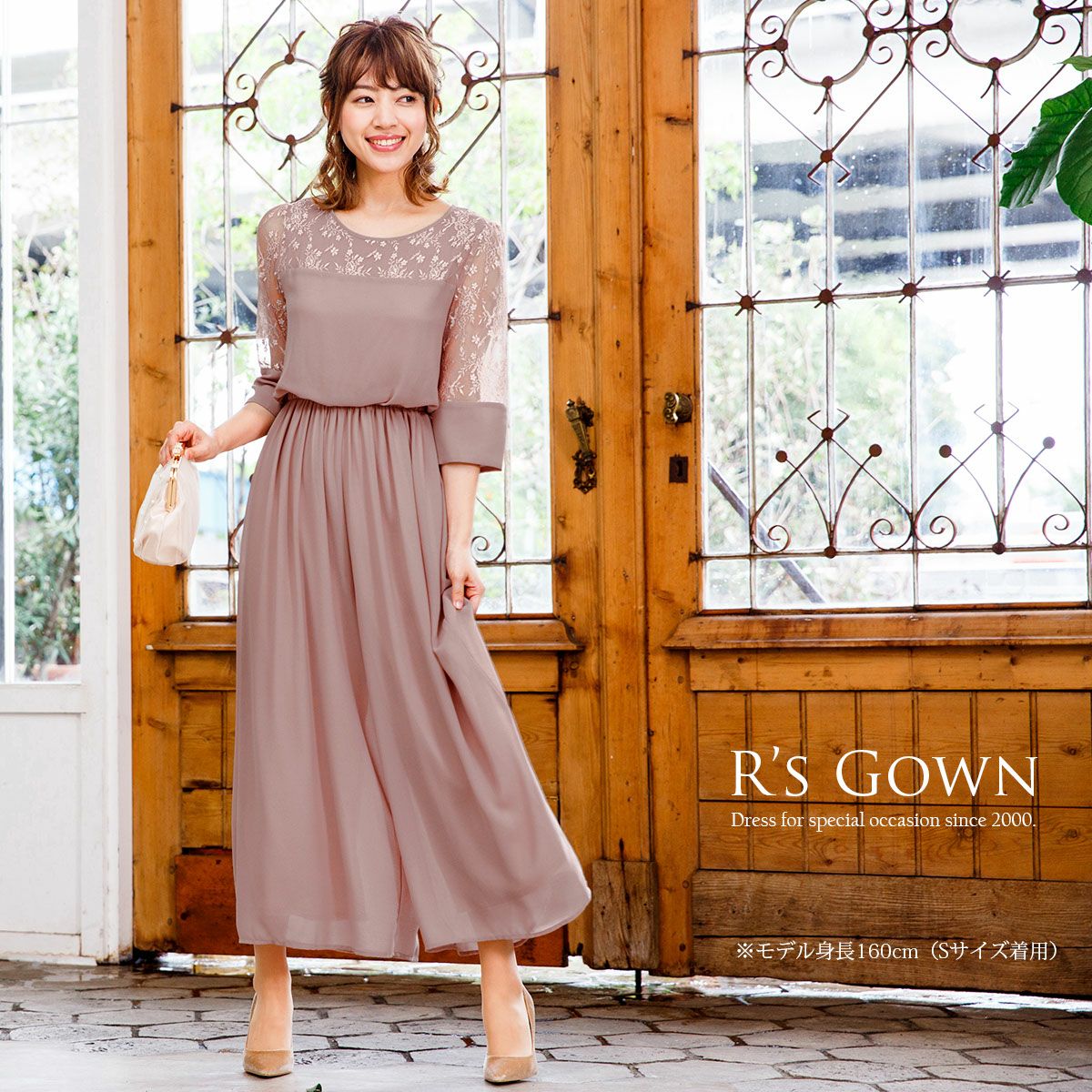 シワになりにくく、さらっとした肌触り良質のジョーゼット素材を使用。 ウエストは伸縮性に優れたゴム仕立てで快適な着心地。ハイウエストでスタイルアップ。 デコルテのパネルレース部分はシフォン素材の裏地付き。 透け感のあるレースの七分袖は、幅広のカフスがドレスのワンポイントに。