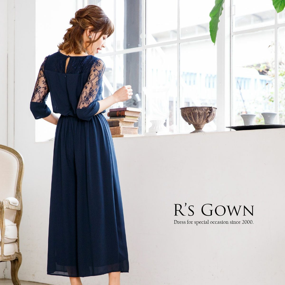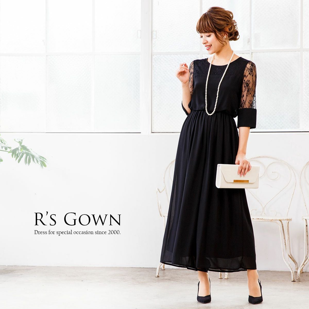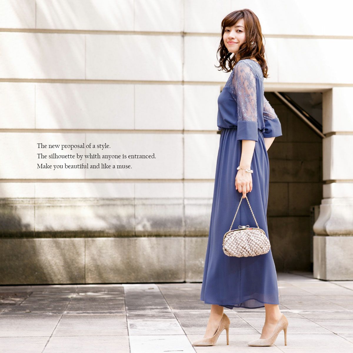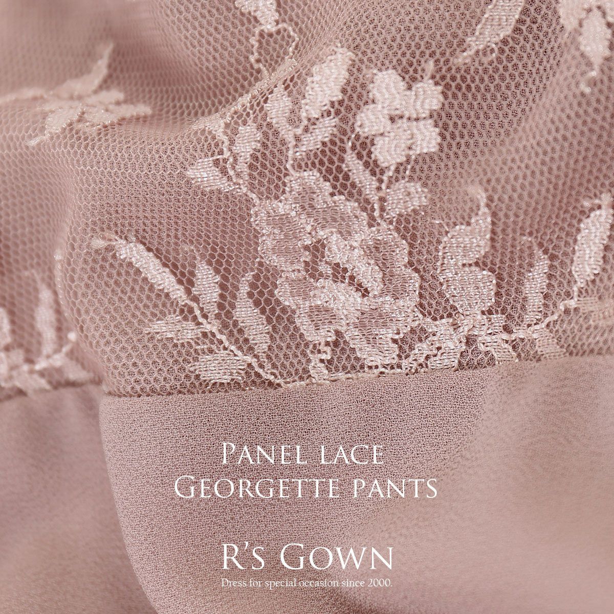 シワになりにくく、さらっとした肌触り良質のジョーゼット素材を使用。 ウエストは伸縮性に優れたゴム仕立てで快適な着心地。ハイウエストでスタイルアップ。 デコルテのパネルレース部分はシフォン素材の裏地付き。 透け感のあるレースの七分袖は、幅広のカフスがドレスのワンポイントに。