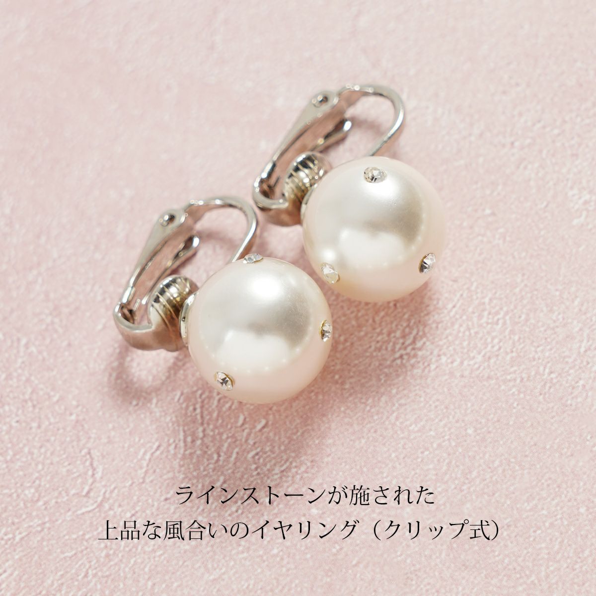 イヤリングは12mmの一粒パールに1.5mmのラインストーンをあしらい、控えめながら顔回りを華やかに演出。