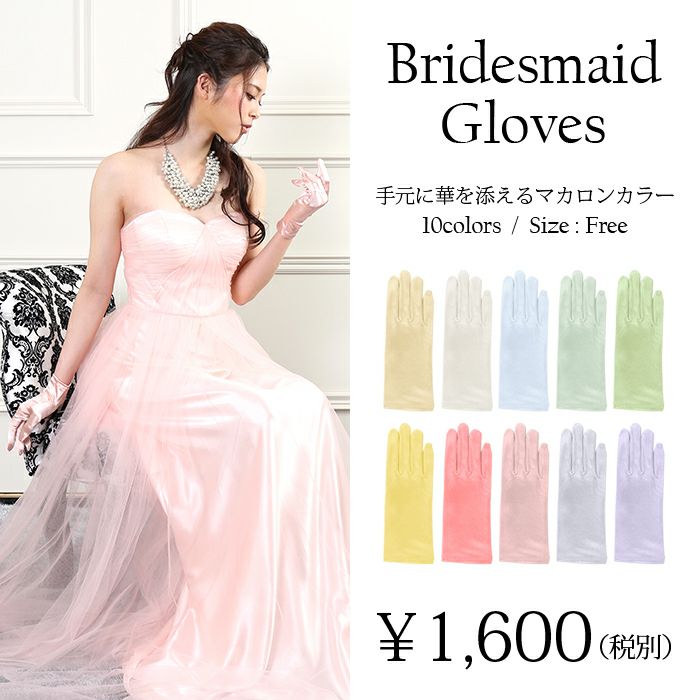 マカロンカラーの選べる10色! ドレスに合わせて、ドレスの挿し色として、柔らかな印象と美しい手元を演出。素材は伸縮に優れたスパンデックス混、上品な光沢でどの色味も華やかさがあります。 ブライズメイドにも、お勧めの小物演出です(^^♪ 手首周りは~17cmまで対応します。