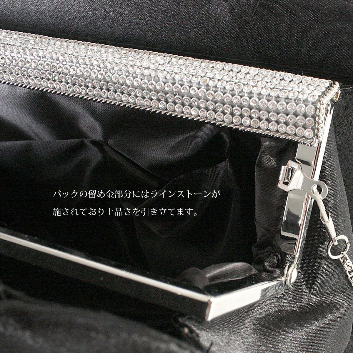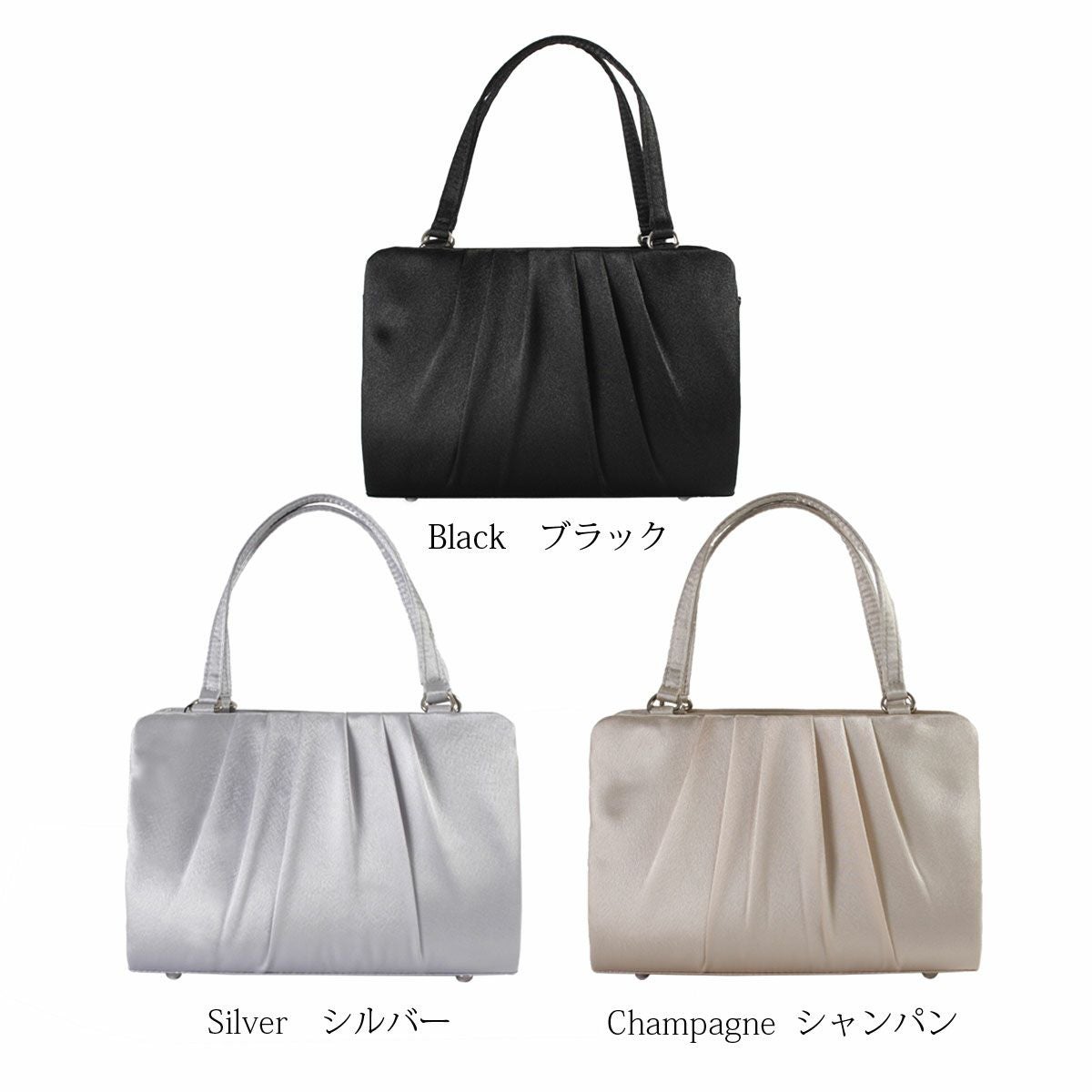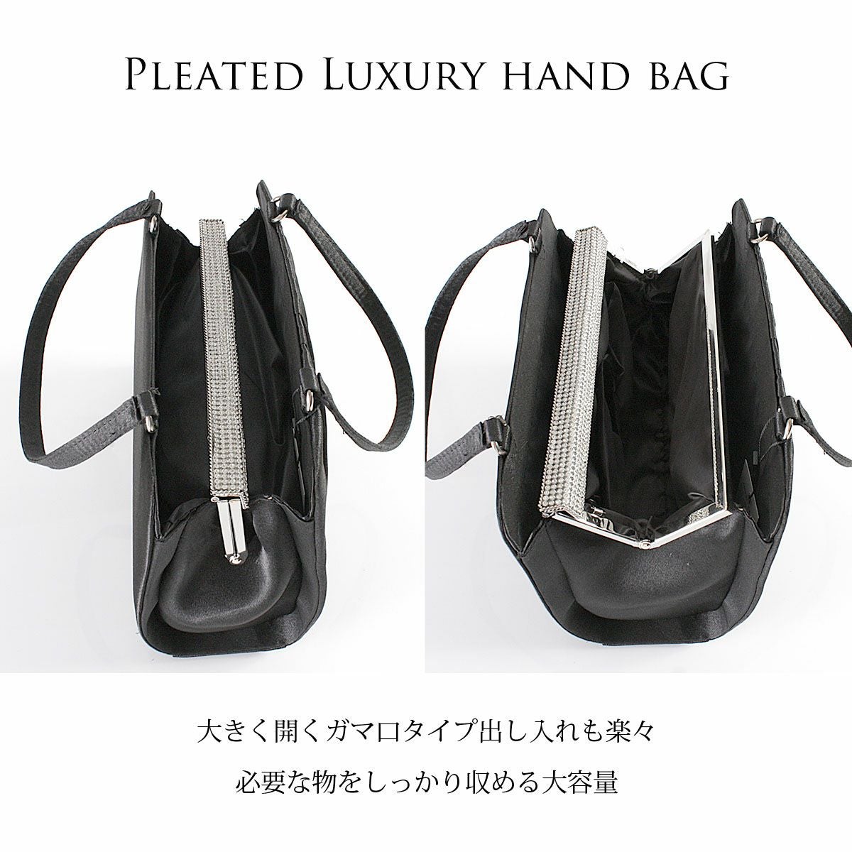 シンプルで上品なサテンスクエアハンドバッグ。メイン収納部はたっぷりのビジューが煌めくがま口仕様。収納スペースがたくさんあり小物の管理がしやすいデザイン。ご祝儀袋も入る嬉しい大容量サイズです。