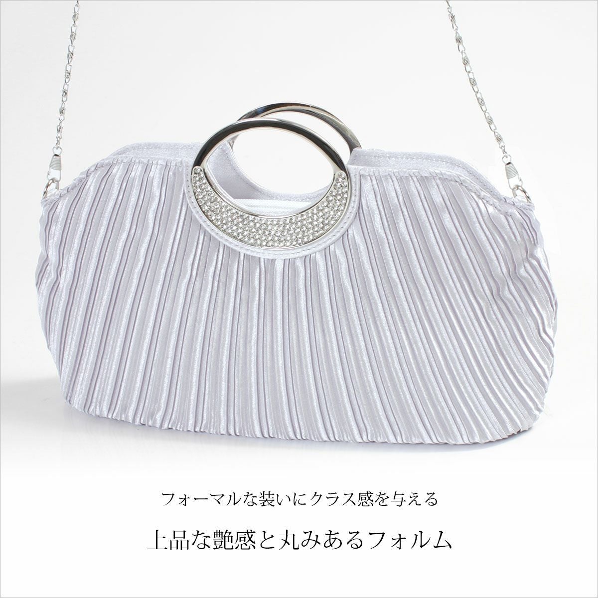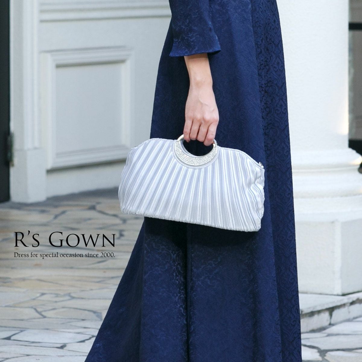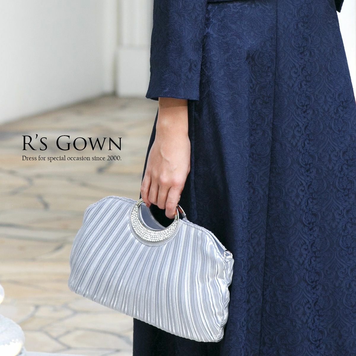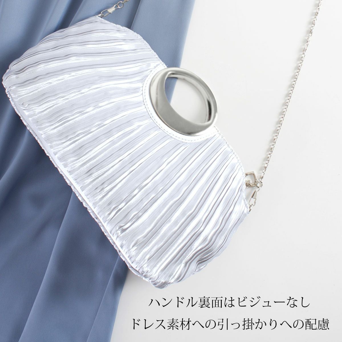 サテン、シフォン、レースなどフォーマルドレス素材と相性の良いマルチなハンドバッグ。丸みを帯びたフォルムはどんなシルエットのドレスにもマッチします。繊細なプリーツ加工、取っ手に施されたビジューは上品でクラス感もプラス。
