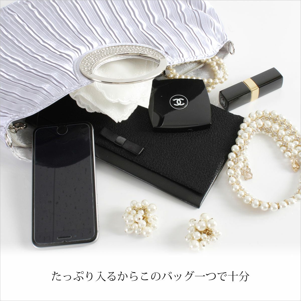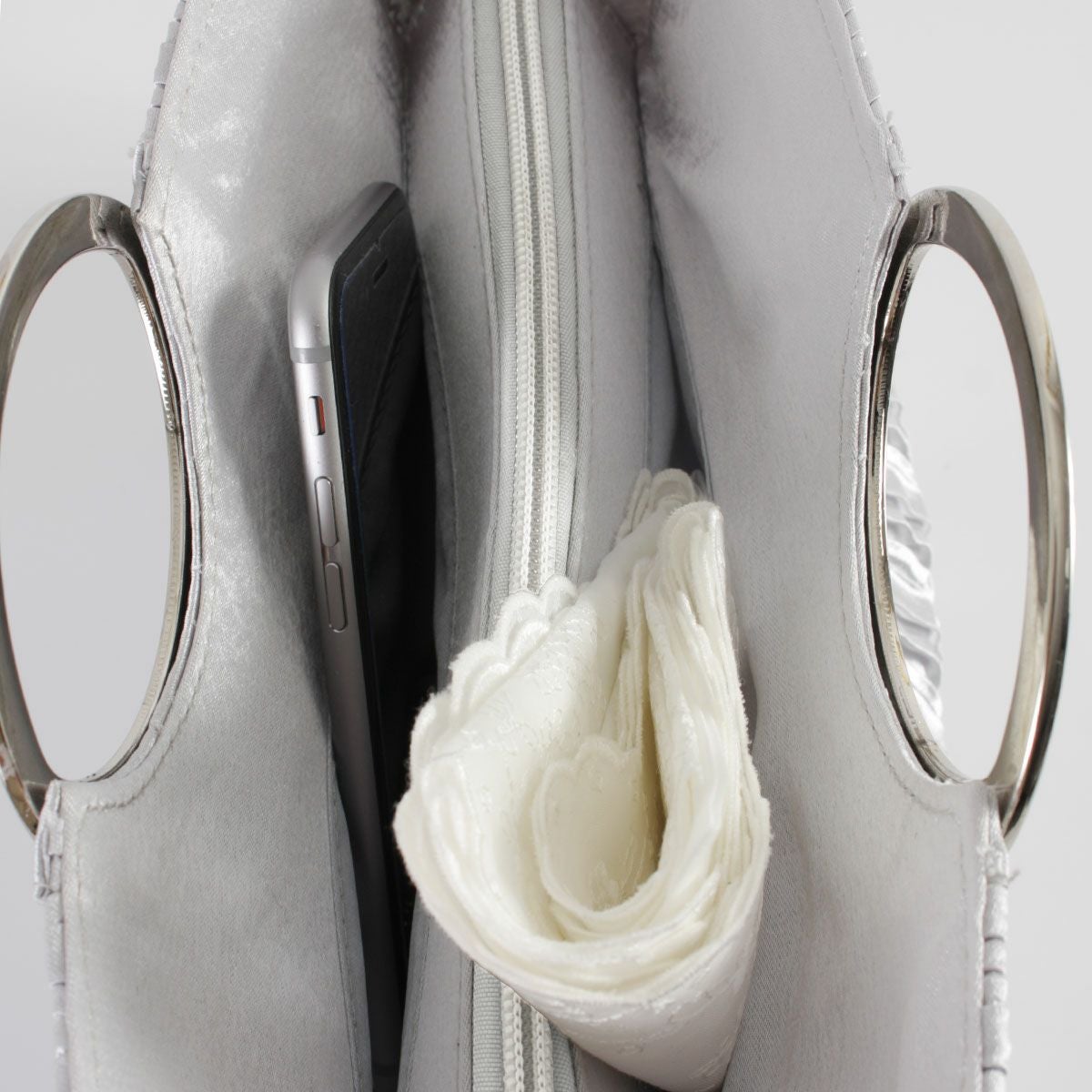 バッグ本体に芯地を使わずに素材を重ねるつくりから見ため以上の容量になっています。移動の多い結婚式などにはとても便利で使いやすい大きな隠しポケットなど、本体のファスナーを開けずともスマホや身だしなみグッズなどを手軽に出し入れ。