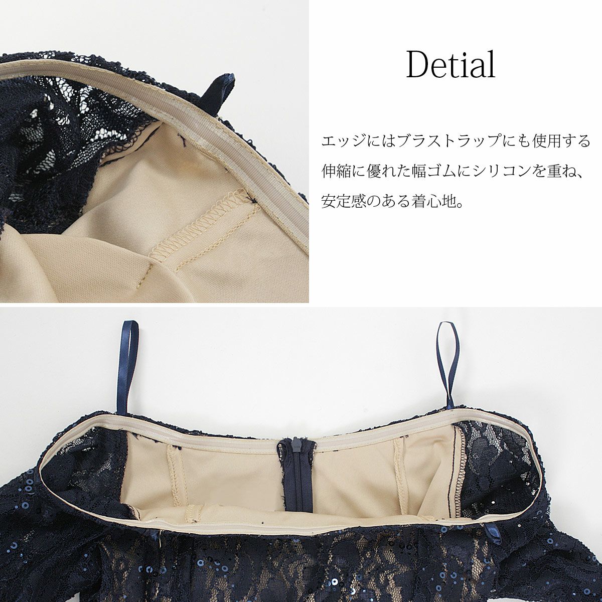 袖付けよりアシンメトリーな袖先に向かって広がるパゴダスリーブは、ほっそり長見せ所作を美しく見せます。 オフショルのデコルテライン、エッジにはブラストラップにも使用する伸縮に優れた幅ゴムにシリコンを重ね、安定感のある着心地。ネイビー・ブラック共に、ヌードベージュにラッセルレースがエッジーに重なり、散りばめられたスパングルはしとやかに輝きを放ちます。後ろヘムラインが前より15cm長いトレーンタイプ。