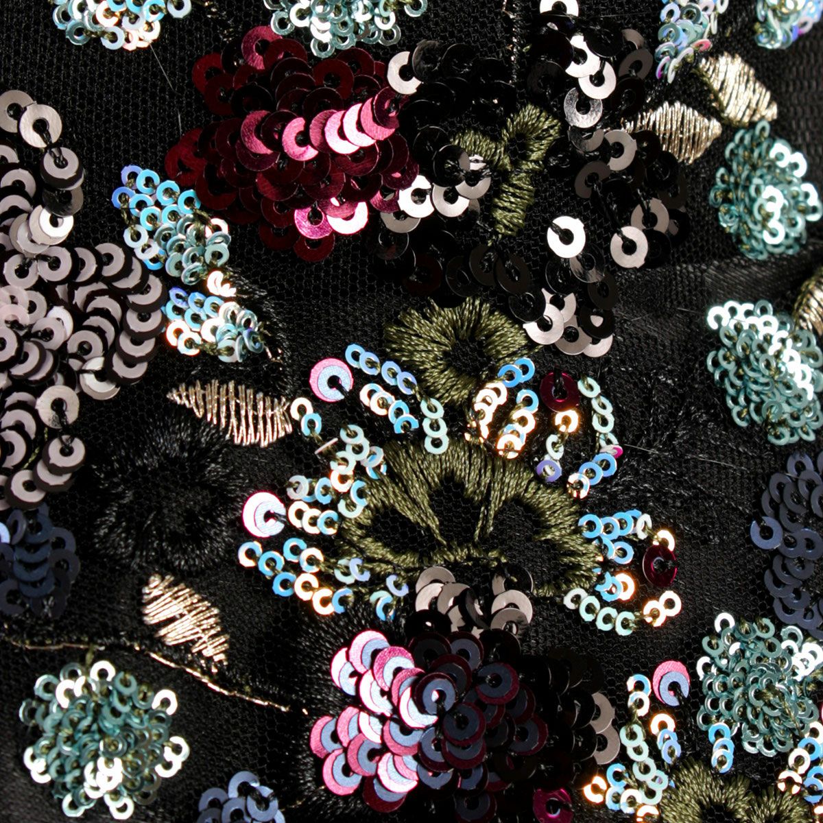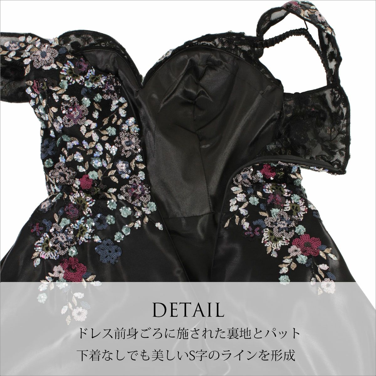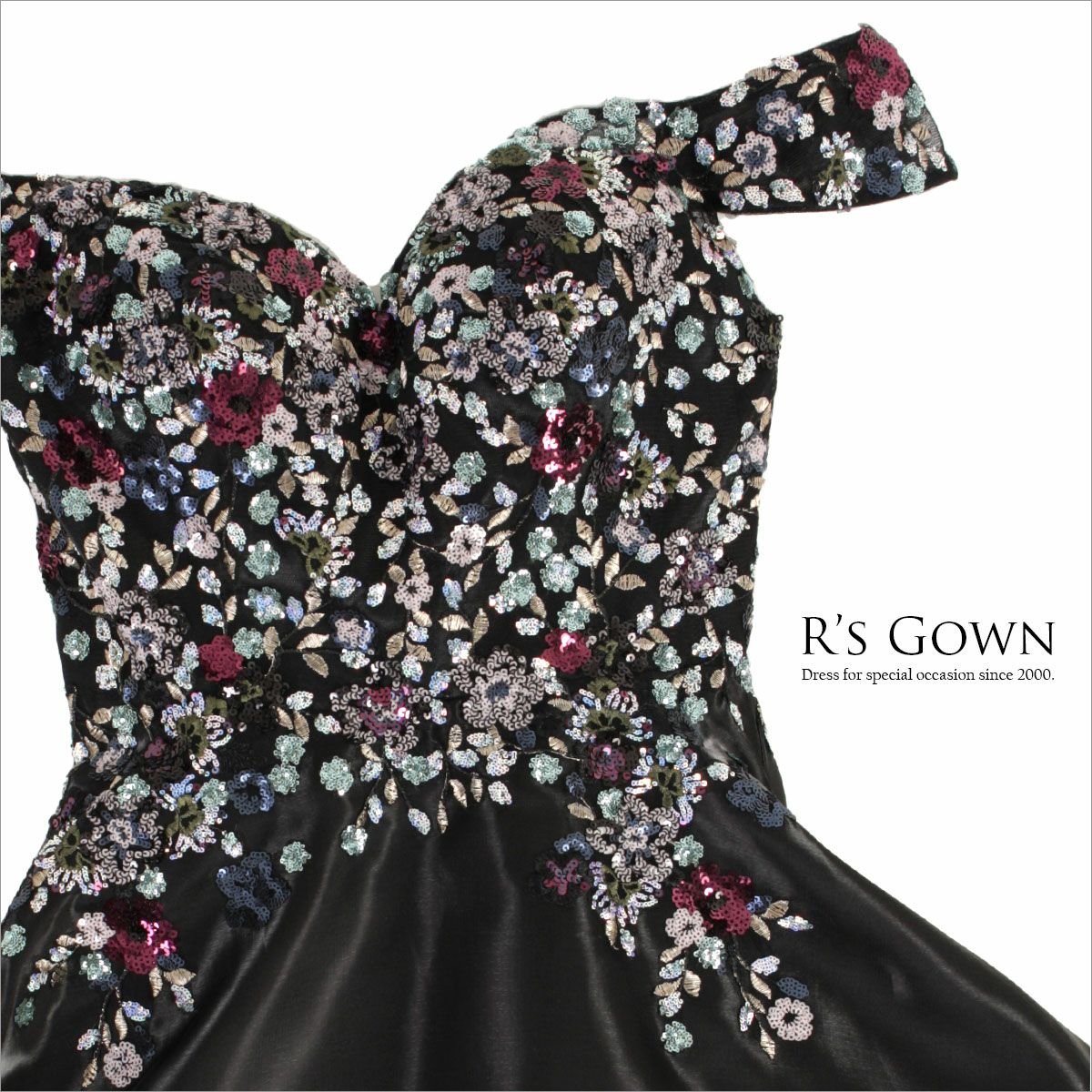 アッシュ系のオリエンタルカラーの色味を重ねたスパンコール刺繍。ドレスのベースカラー、ブラックに重なり立体的な刺繍が繊細な輝きを放ちます。お花をモチーフしにたボタニカル模様。